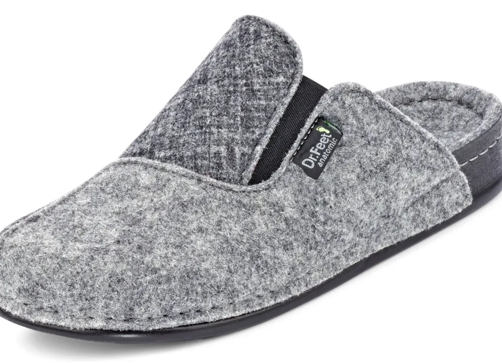 Hausschuhe von „Laurina“ in Grau, aus teilweise bedrucktem Wollfilz: in Weite H, seitlicher Gummizug, anatomisches Filz-Fußbett, superleichte PU-Laufsohle sowie 20 mm Keilabsatz