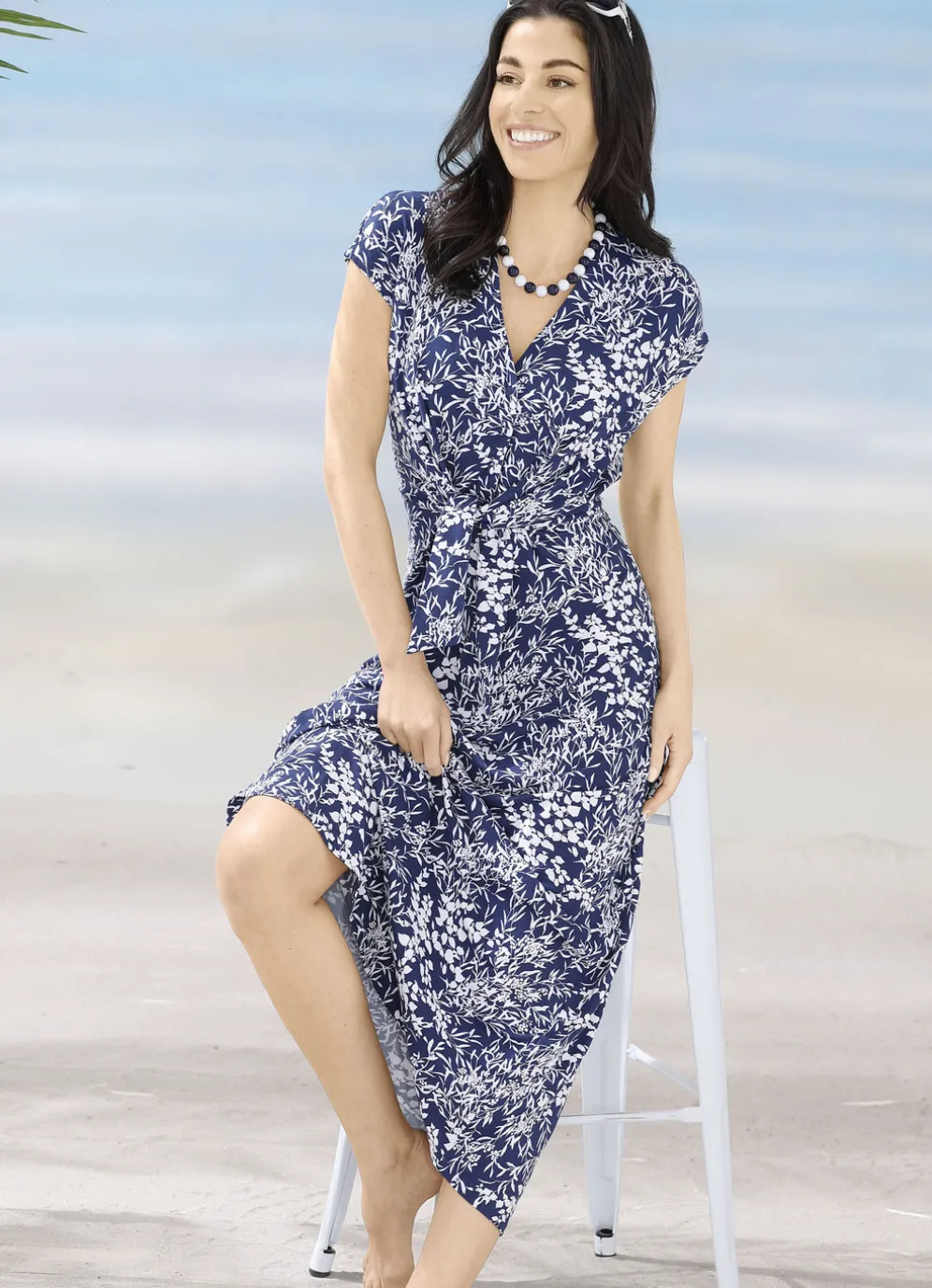 Marinefarbenes „Laurina“-Kleid mit überschnittenen Ärmeln und floralem, weißem Druckdessin allover. Die kleine Knopfleiste, der Gummizug im Rückteil sowie die eingearbeiteten Bindebänder sorgen für eine raffinierte Optik und optimale Passform. Länge ca. 126 cm.