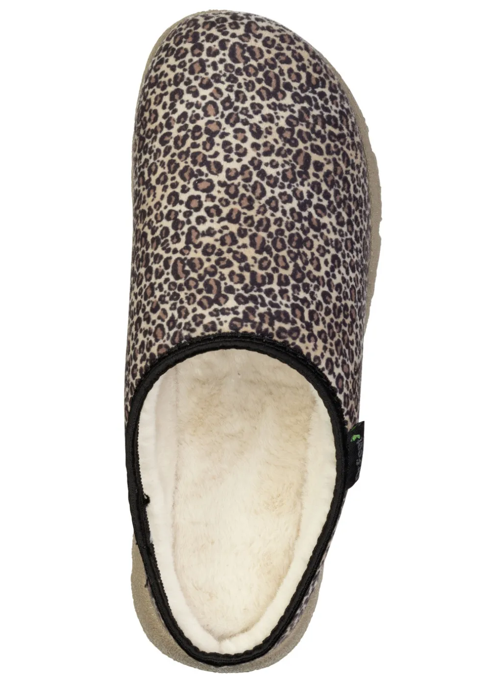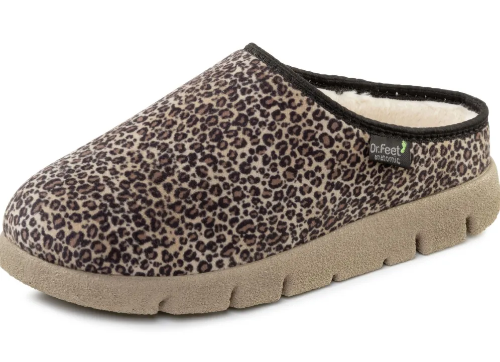 Modische Hausschuhe von „Laurina“, aus samtigem, braunem Textilmaterial, mit rassigem Leoparden-Dessin: Futter und Decksohle aus flauschigem Plüsch, leichte PU-Profilsohle sowie 10 mm Keilabsatz