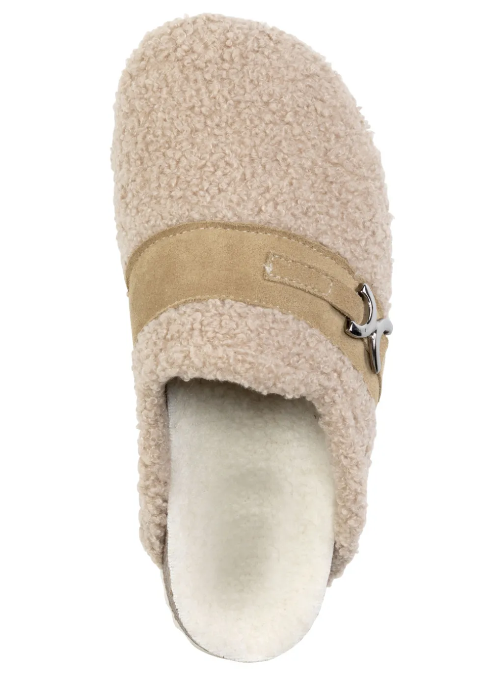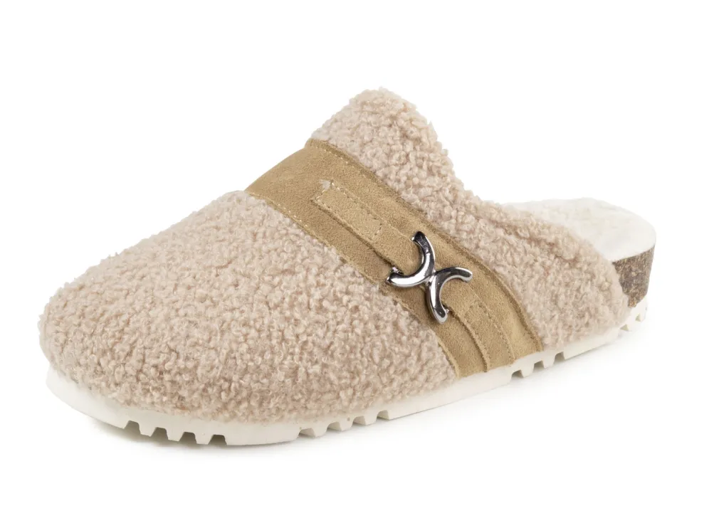 „Laurina“-Pantoffel aus weichem Plüsch mit Veloursbesatz: Weite H, anatomisches Kork-Textilfußbett sowie flache PU-Profilsohle