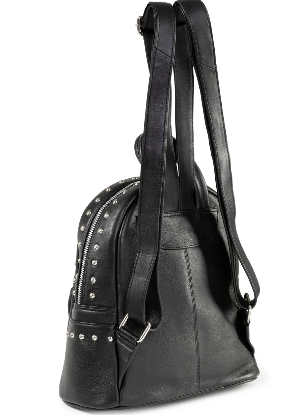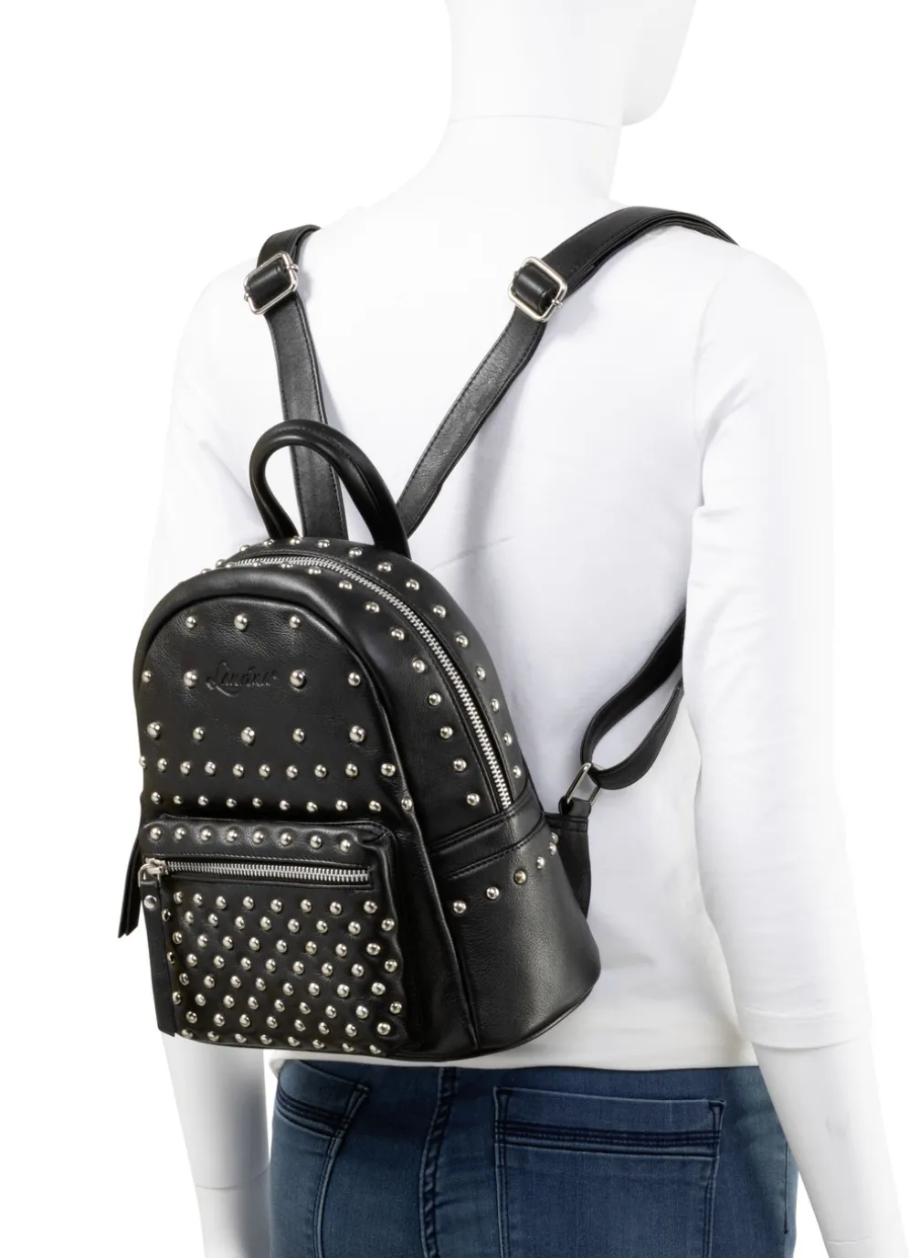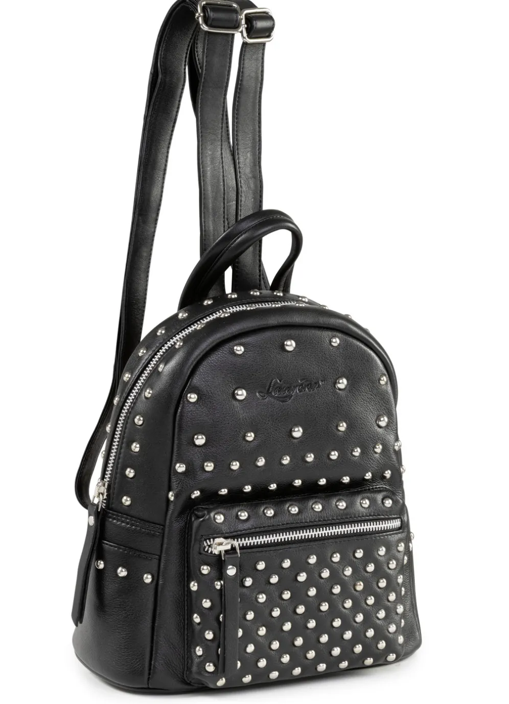 Rucksack von „Laurina“, aus weichem Rind-Nappaleder mit trendigen Ziernieten: je ein Haupt-, Innen- und Vorfach mit Reißverschluss, Textilfutter, ein kurzer Tragegriff, zwei verstellbare Umhängeriemen ca. 58-105 cm. Gr: 24x26x12 cm