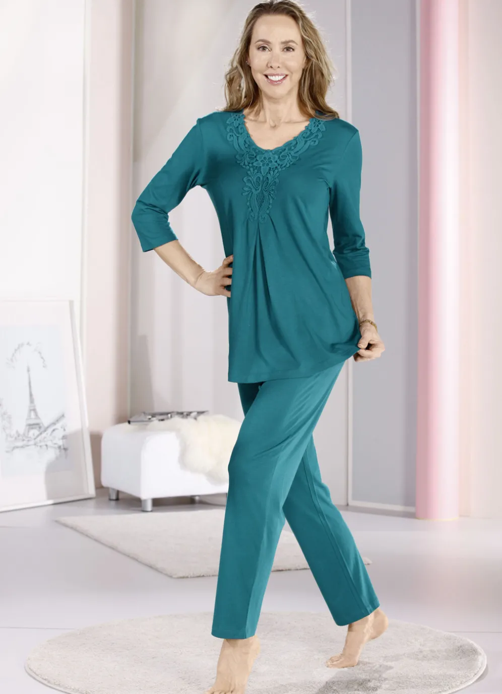 Laurina Schlafanzug mit großzügiger Motivspitze in Petrol und in Größe 38.