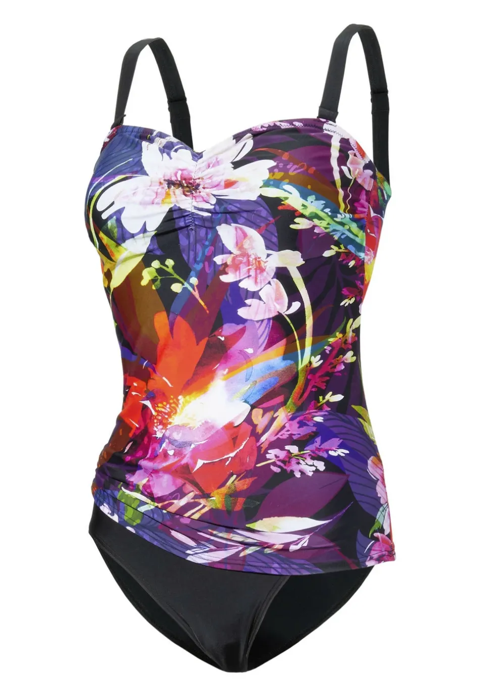 Schwarzer „Laurina“-Tankini in Bandeauform mit buntem Druckdessin allover, kleiner Raffung in der Büstenmitte, verstell- und abnehmbaren Trägern, Softschalen und Unterbrustband. Schwarzes Höschen mit Vorderfutter.