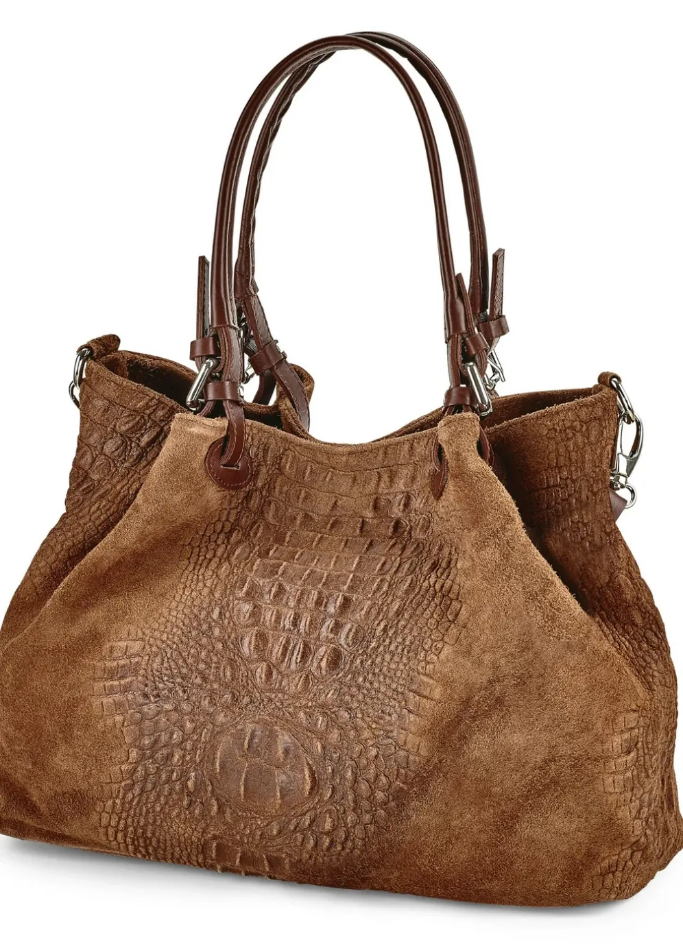 Tasche von Laurina in Cognac, aus Kalb-Veloursleder mit raffinierter Reptilprägung: Magnetverschluss-Hauptfach, Reißverschluss-Innenfach, Steckfach, Textilfutter, zwei Tragegriffe ca. 47 cm, ein abnehmbarer Umhängeriemen ca. 102 cm. Gr: 35x29x16 cm