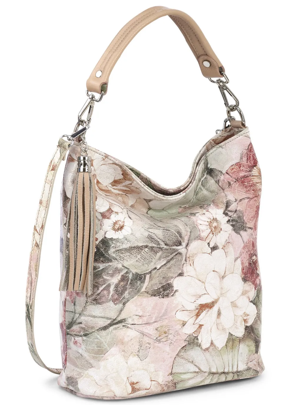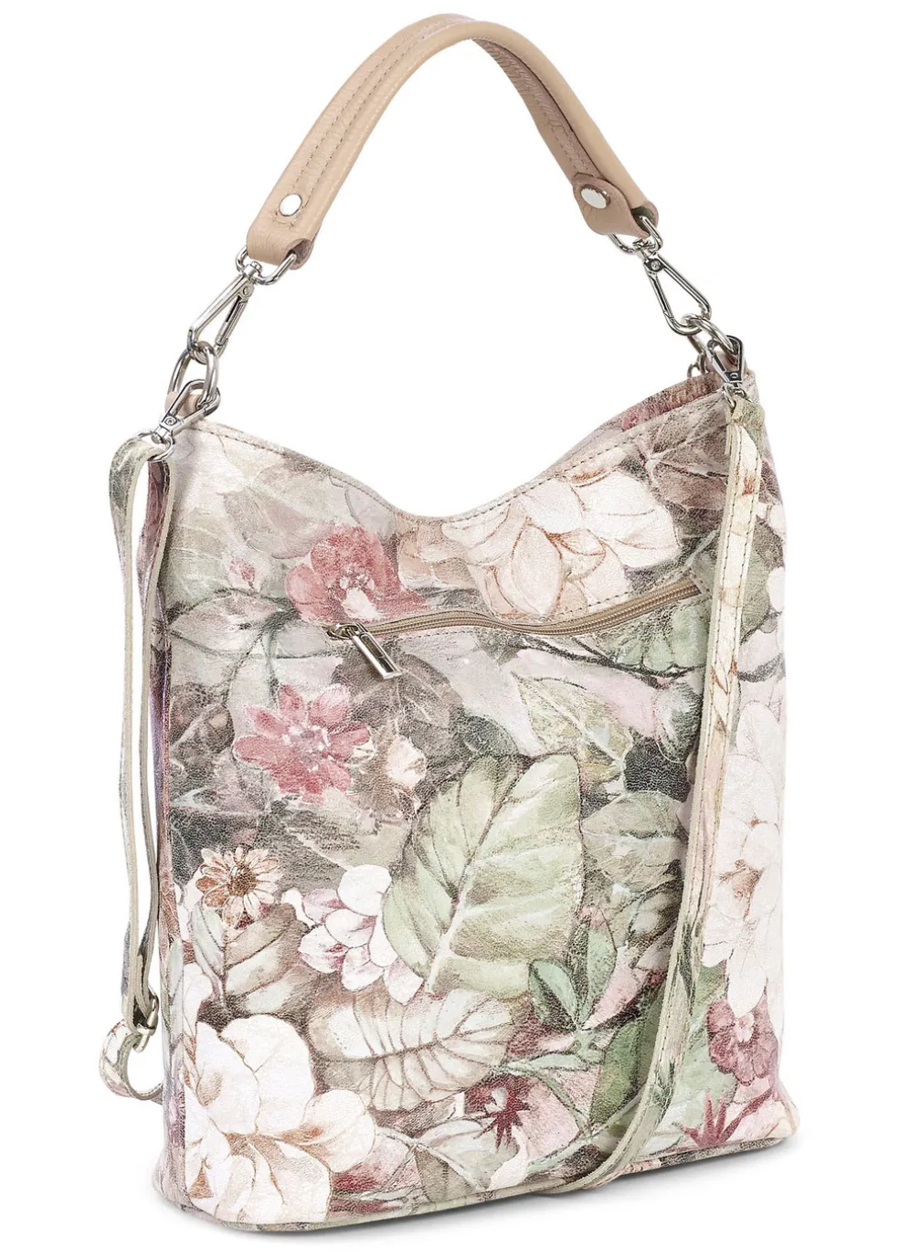 Tasche von Laurina in Rosa-Ecru, aus floral bedrucktem Kalbleder: Reißverschluss-Hauptfach, diverse Reißverschluss- und Steckfächer, Textilfutter, ein Tragegriff ca. 35 cm, ein verstellbarer Umhängeriemen ca. 65-112 cm, jeweils abnehmbar Gr: 30x30x12 cm