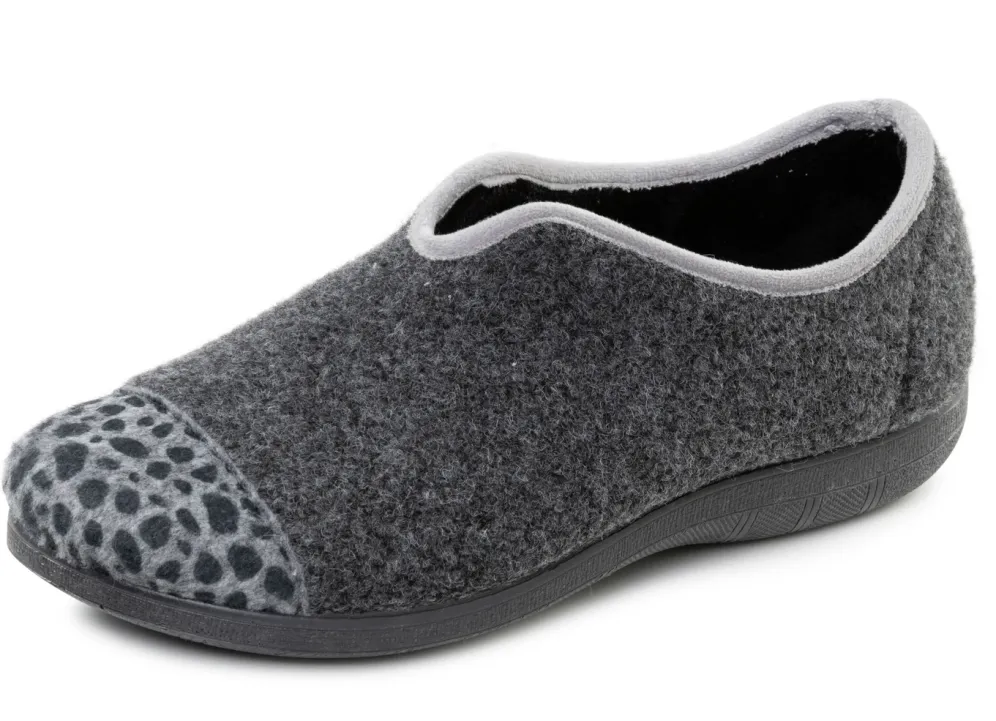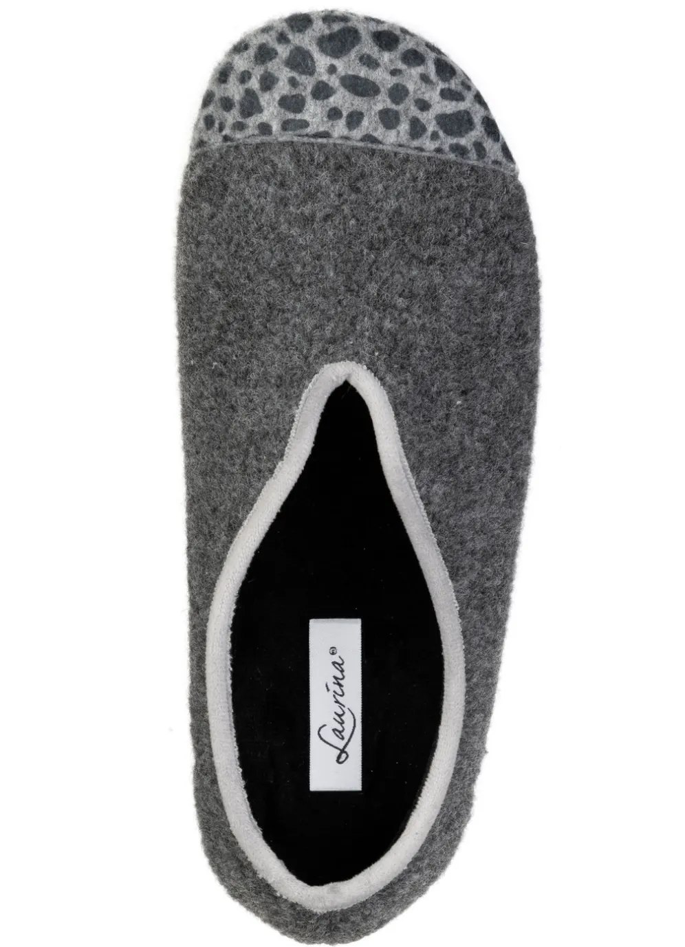 Hausschuhe von „Laurina“, aus Filz, teilweise mit Leo-Druck: Weite H, Futter und gepolsterte Decksohle aus Samt, leichte Gummi-Laufsohle sowie 15 mm Keilabsatz