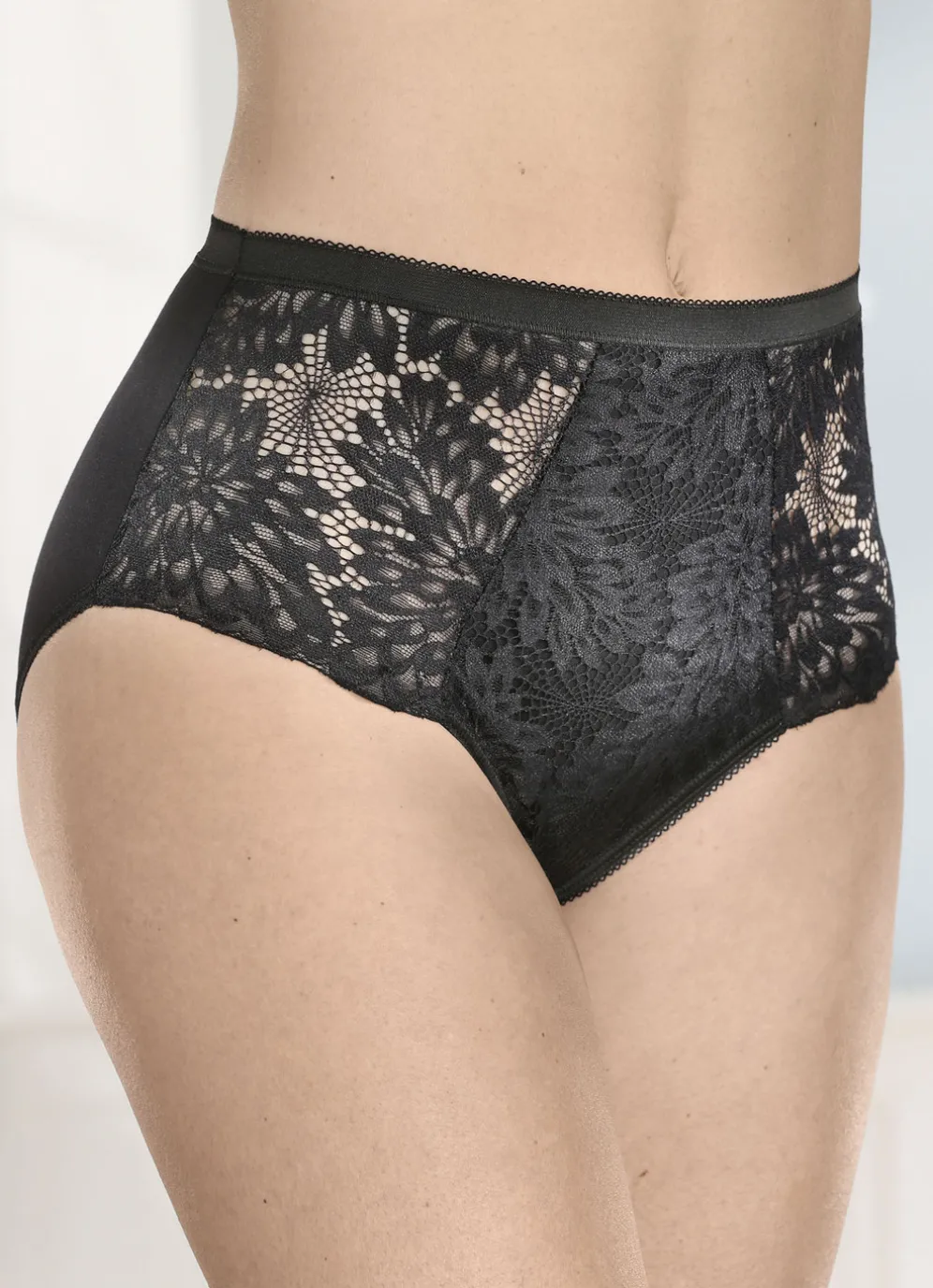 „Laurina“-Slip mit dezent glänzender Elastikspitze im Vorderteil, unterlegter Bauchpartie sowie elastischen Abschlüssen.