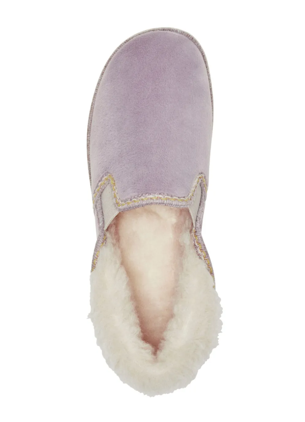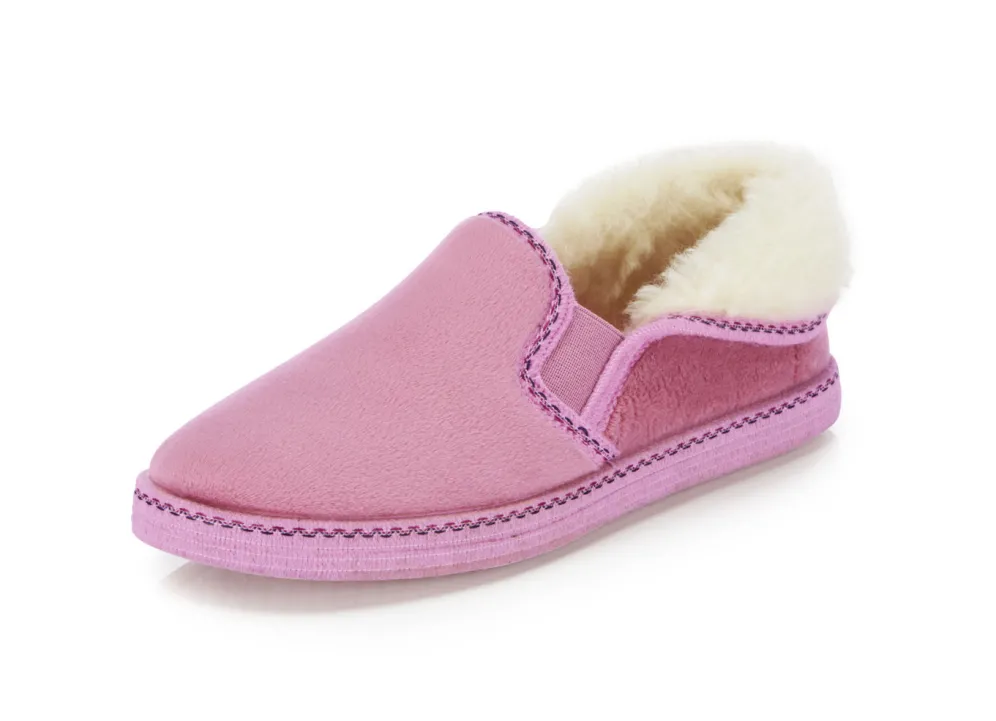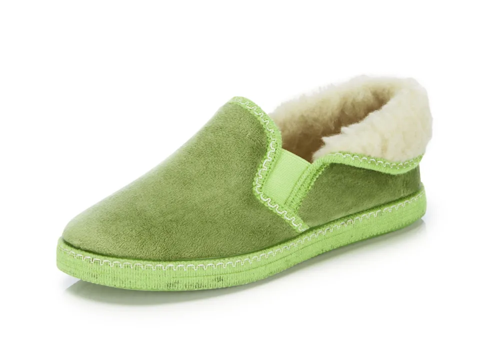 Hausschuhe von „Laurina“, aus samtigem Textil, mit hübscher Bordüre: zwei seitliche Gummizüge, flauschiger Kragen, Warmfutter und Decksohlenbezug aus 100% Schurwolle, leichte Gummi-Riffelsohle