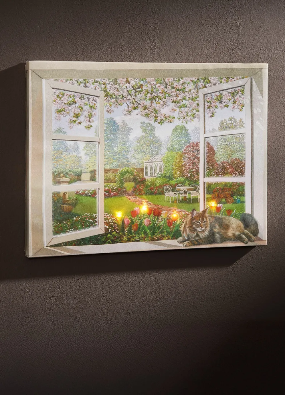 Einen traumhaften Ausblick auf einen blühenden Garten können Sie auf diesem beleuchteten Bild genießen. Auf der Fensterbank hat es sich eine niedliche Katze gemütlich gemacht. Beleuchtet wird das Ganze mit 4 LEDs. Batteriebetrieben mit 2x 1,5 Volt Mignon (nicht im Lieferumfang enthalten). Mit An-/Aus-Schalter an der Seite. Auf einen Holzrahmen gezogene Leinwand. Maße: ca. B28xH38xT1,5 cm.