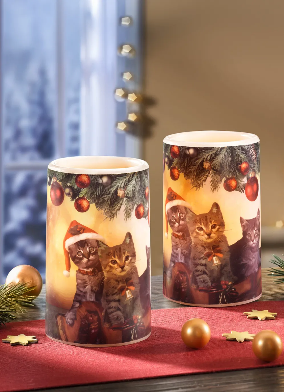 Für stimmungsvolles Licht sorgen diese zauberhaft gestalteten LED-Echtwachskerzen im 2er-Set. Mit einem weihnachtlichen Katzen-Motiv verziert. Batteriebetrieben mit 3x 1,5 Volt Micro (nicht im Lieferumfang enthalten). Maße: je ø 7,5 cm, Höhe 12 cm.