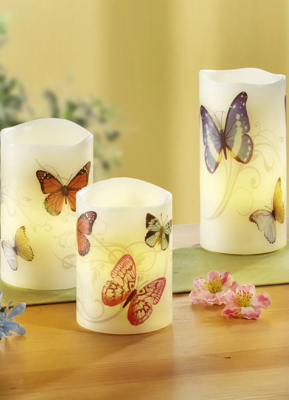 LED-Echtwachskerzen mit frühlingshaften Schmetterlingssmotiv, 3er-Set