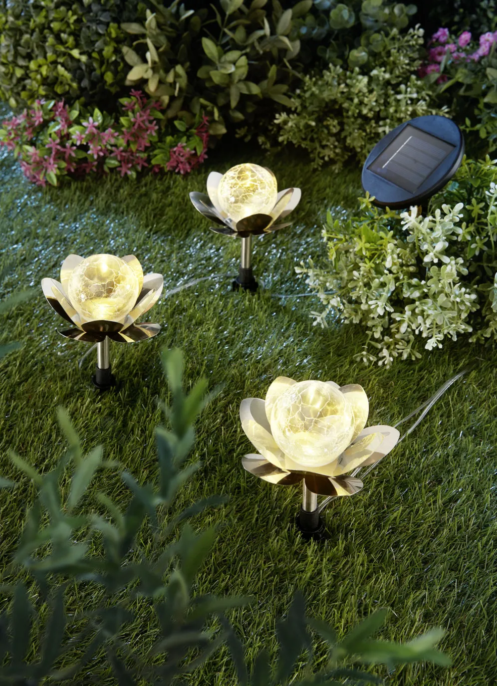 Nicht nur am Tage sind diese 3 Seerosen in Silber ein wunderschöner Blickfang. Wenn nach Einbruch der Dunkelheit die Glaskugeln hell erleuchten und Ihnen und Ihren Gästen den Weg weisen, entsteht eine zauberhafte Atmosphäre in Ihrem Außenbereich. Einfach mit den Erdspießen in den Boden stecken – Fertig. Aus Edelstahl, Glas und Kunststoff.
