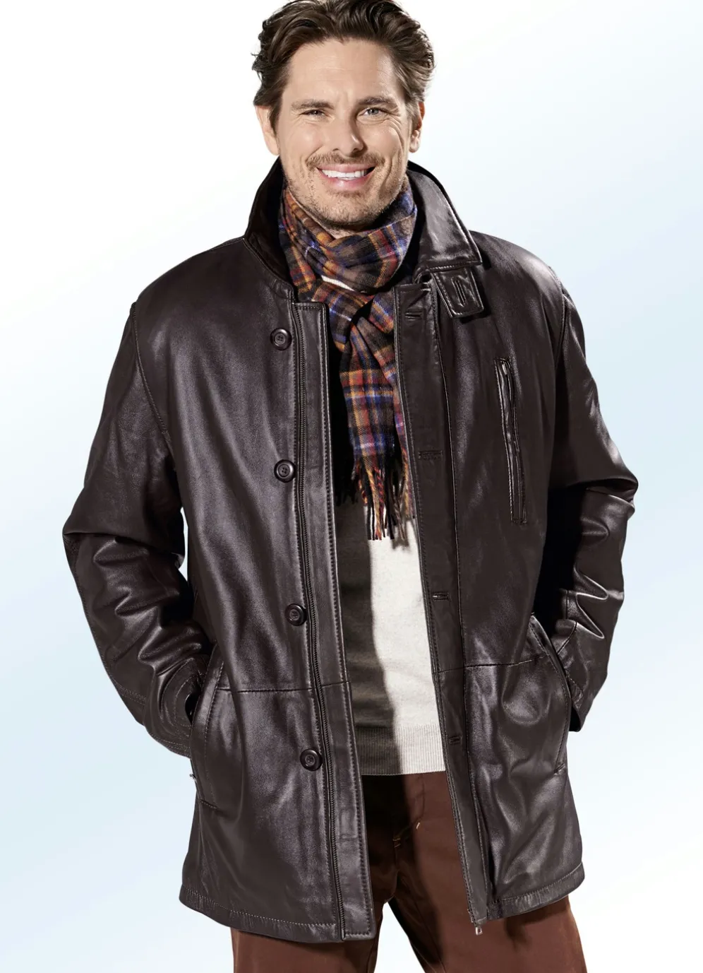 Trendstarke Jacke aus dunklem, antik bordeauxfarbenem, weichem Lamm-Nappaleder: Umlegekragen mit Riegel und Knopf, Reißverschluss unter der Knopfleiste, Reißverschluss-Doppeltaschen, Reißverschluss-Brusttasche sowie drei Innentaschen.