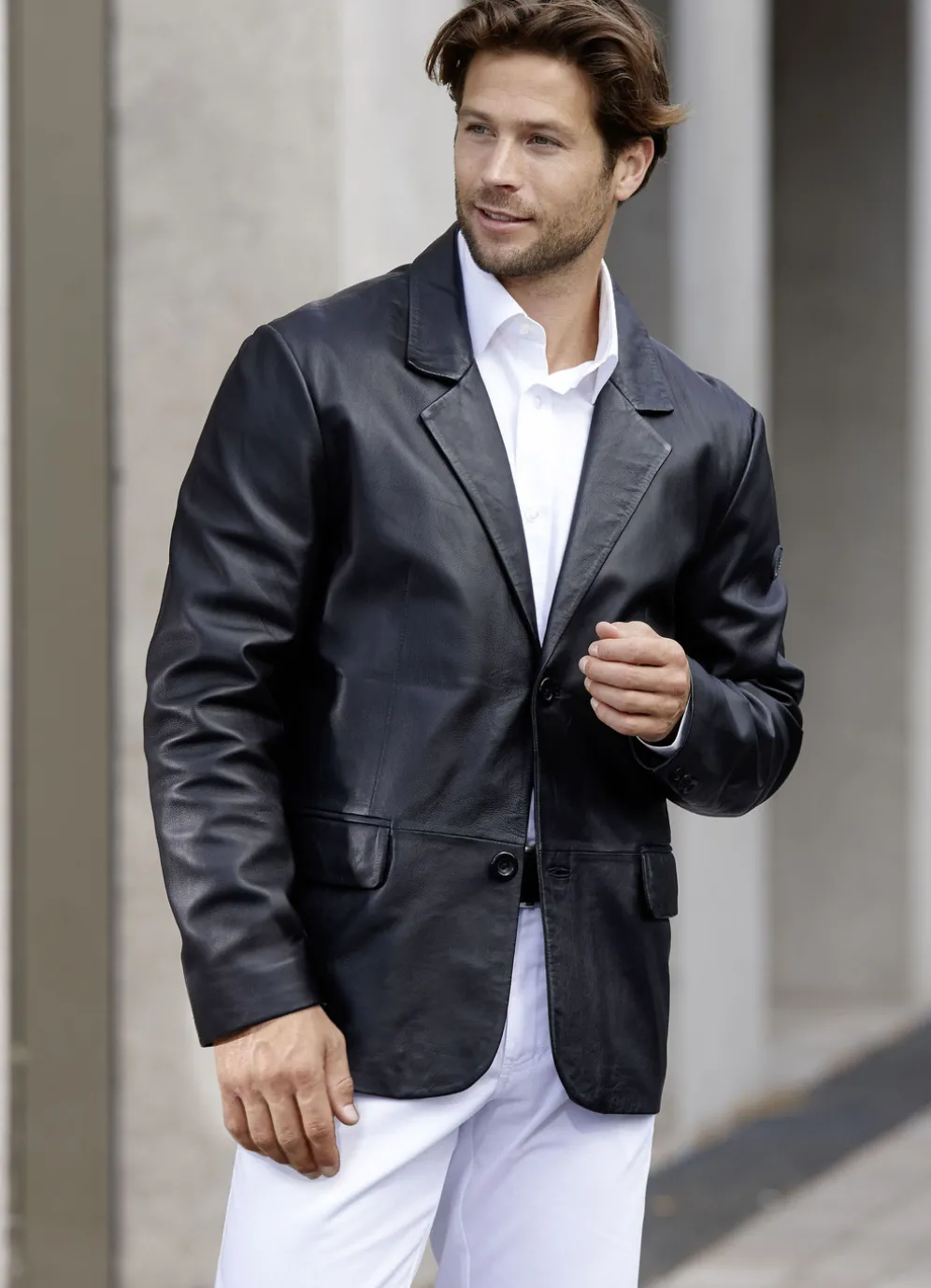 Ein absoluter Blickfang ist dieser charakterstarke, schwarze Blazer aus handschuhweichem Lamm-Nappaleder, mit Reverskragen, 2-Knopf-Verschluss, Pattentaschen, drei Innentaschen sowie Rückenschlitz.