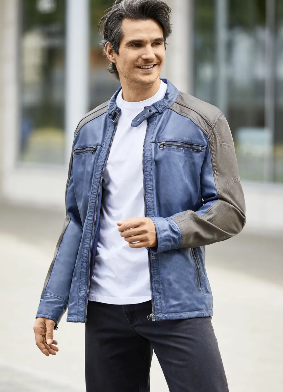 Lederkurzjacke mit Reißverschluss-Taschen in Antik Jeansblau-Dunkelbeige und in Größe 52.