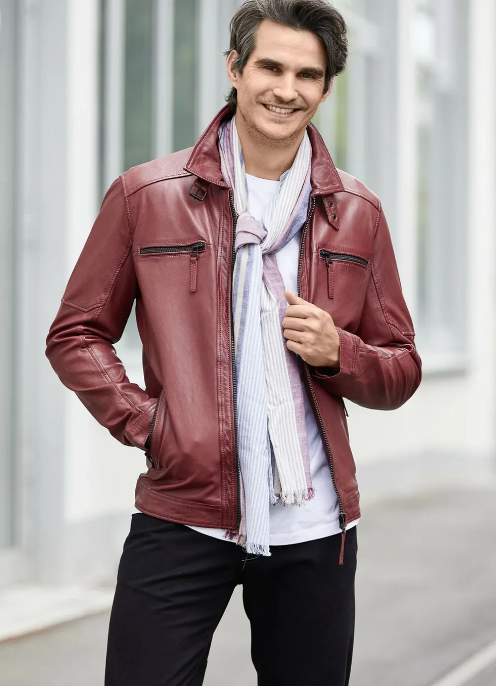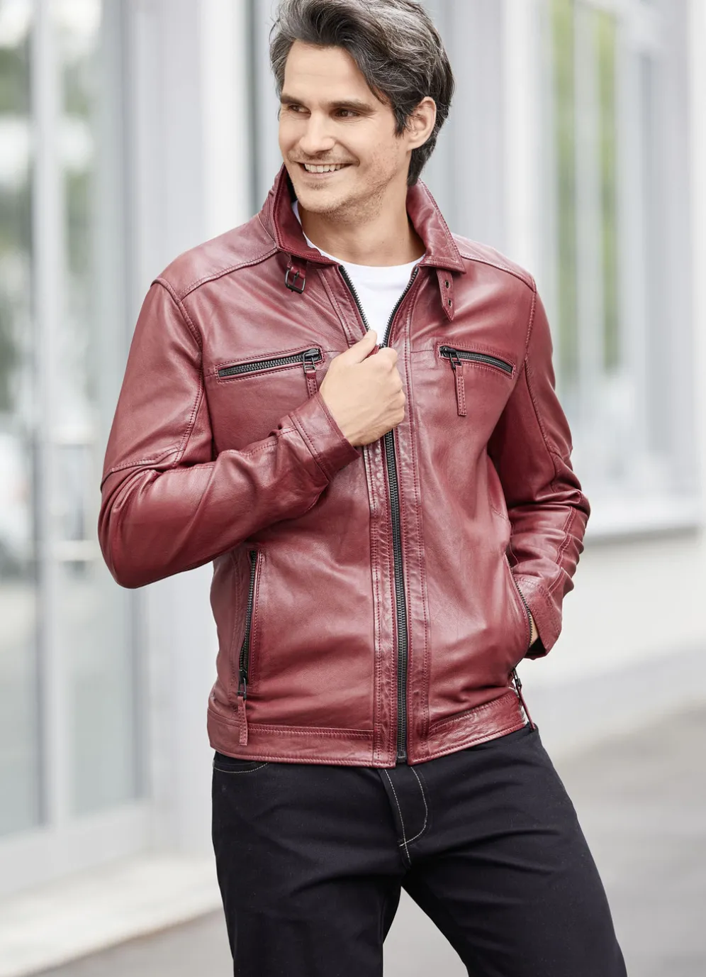 Lederkurzjacke mit zwei Innentaschen in Antik Dunkelrot und in Größe 52.