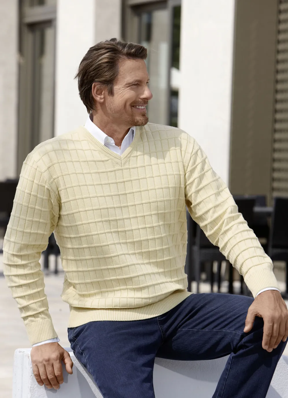 Große Klasse ist dieser legere V-Pullover mit Strukturdessin allover sowie Rippenstrick- Abschlüssen.