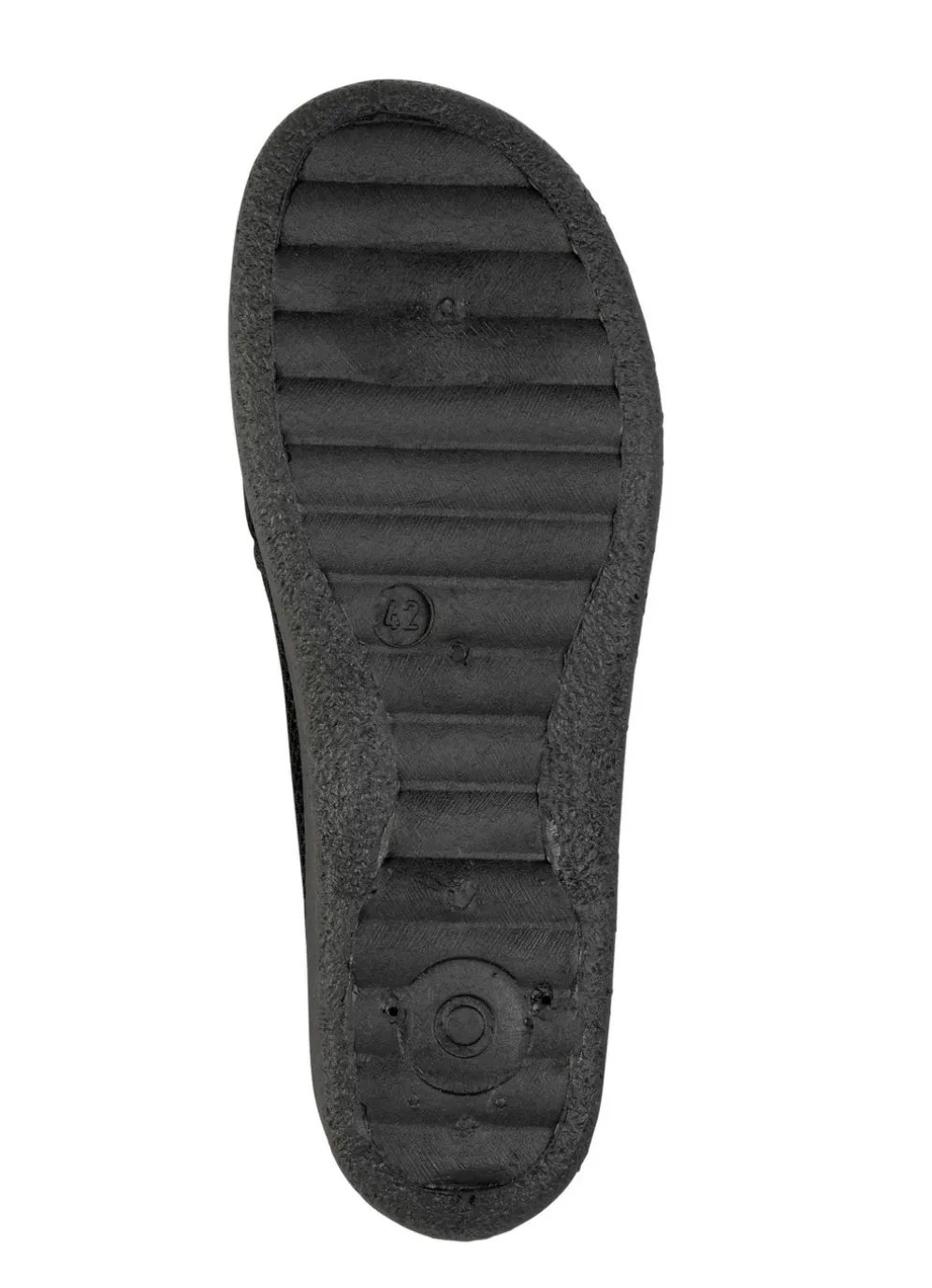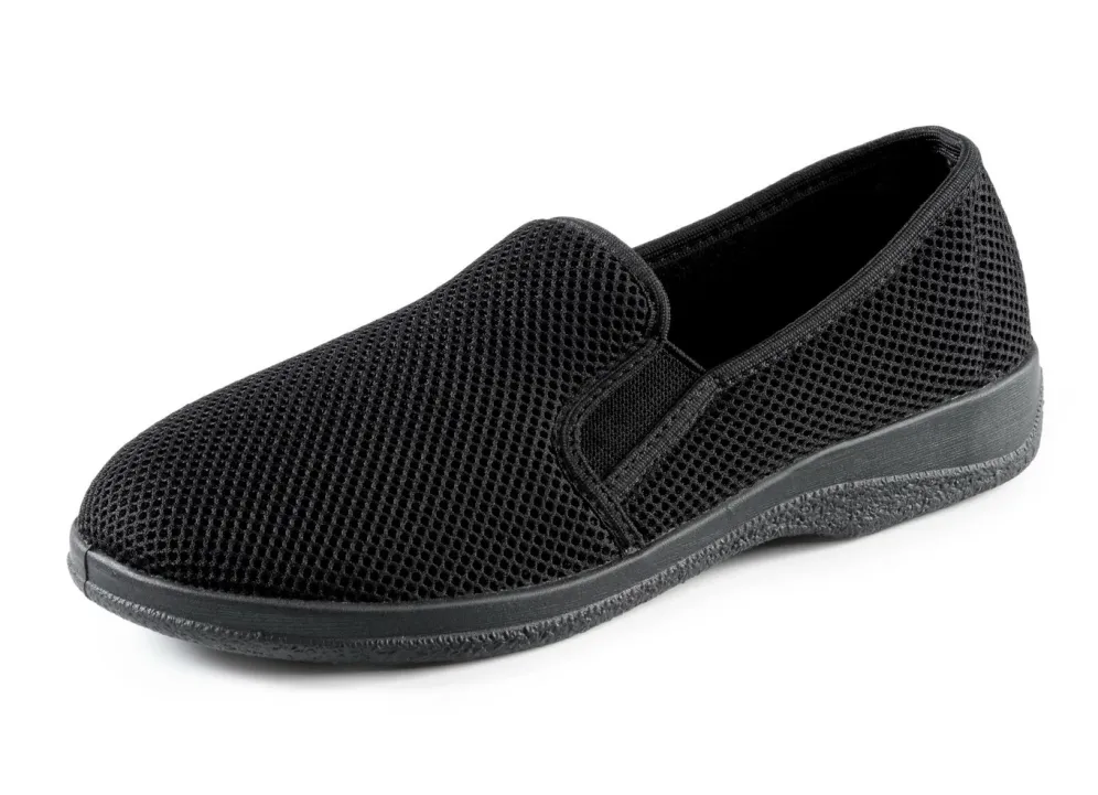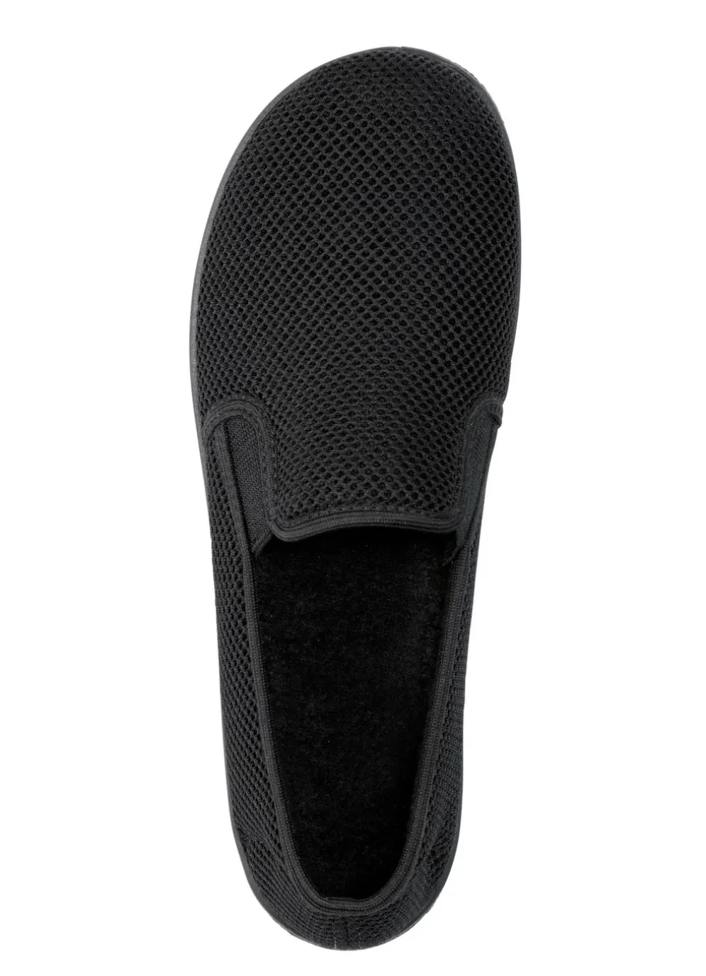 Schwarze Hausschuhe aus luftigem, elastischem Textilmaterial, mit zwei seitlichen Gummizügen: Futter und Decksohle aus Frottee, leichte Synthetik-Laufsohle