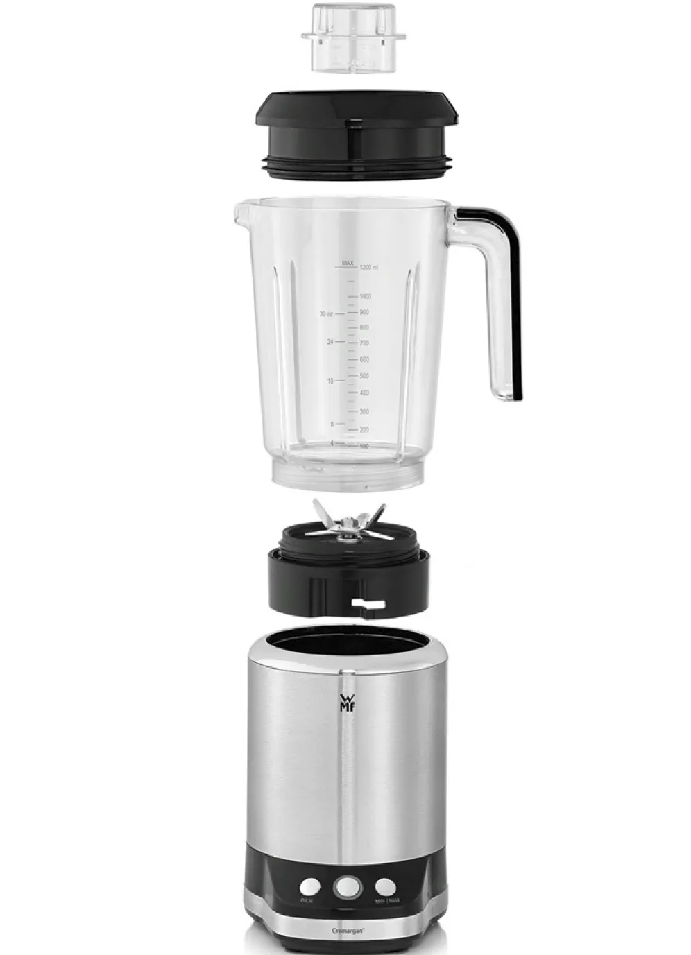 WMF Standmixer aus Cromargan®-Edelstahl mit 2 Geschwindigkeitsstufen und Pulse-Funktion. Ideal für fruchtige Smoothies, schaumige Milch-Shakes, Cocktails, Saucen, Babynahrung, zum Pürieren, Mixen, Schlagen, Zerkleinern und Mahlen. Zerkleinert selbst Nüsse und Eis. Mit abnehmbarem Mixkrug aus Tritan (1,2 Liter) mit Skalierung und Deckel mit Nachfüllöffnung sowie integriertem Messbecher.