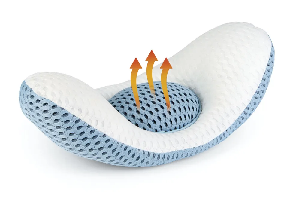 Mit angenehmer Wärme- und Massagefunktion. Die ergonomische Form passt sich der natürlichen Krümmung der Lendenwirbelsäule an und kann so Rückenbeschwerden vorbeugen. Kann die Rückenmuskulatur entlasten. Beim Rücken- und Seitenschlafen wird der Druck auf die Hüfte vermindert. Das einzigartige Design mit eingegrenztem Schlafbereich verhindert das Verrutschen des Kissens. Durch