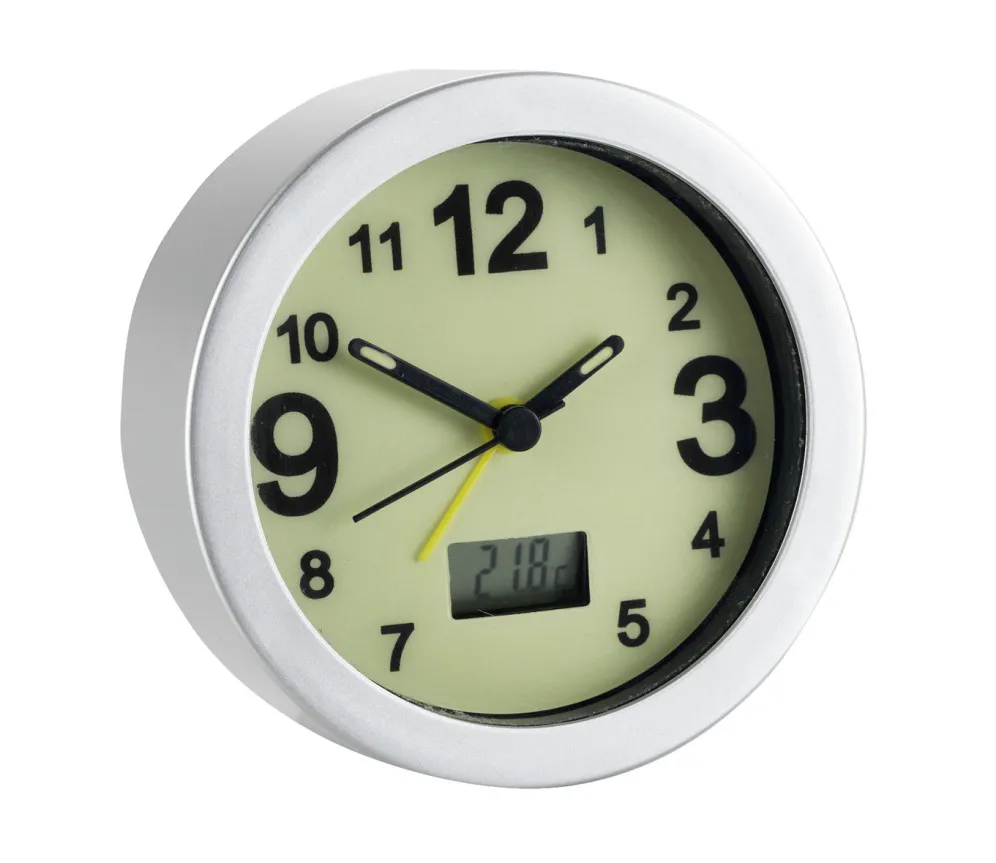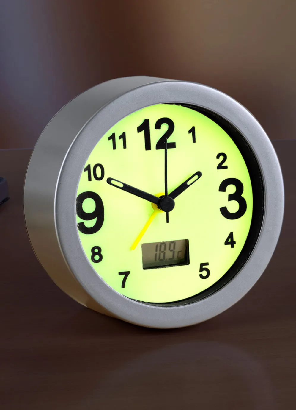 Leuchtender Wecker mit digitaler Raumtemperaturanzeige in Silber-Schwarz.