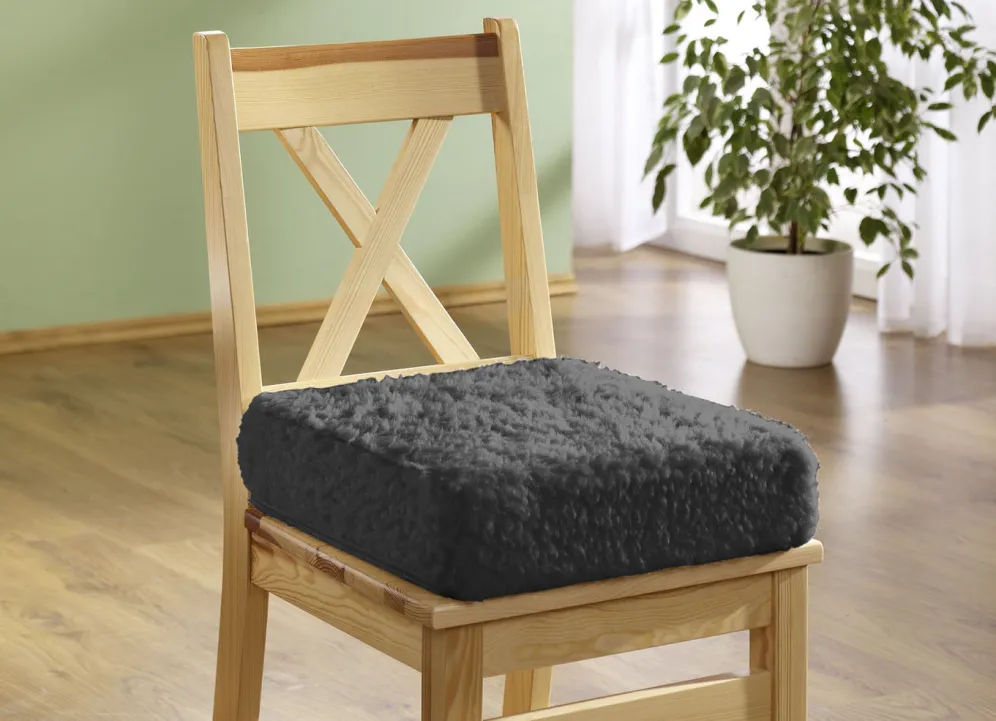 Herrlich bequeme Licardo-Wohn-Accessoires, gemustert oder uni, aus 100% Schafschurwolle im Flor. Handwäsche bis 30 °C. Mit Samtband-Einfassung (außer der Sitzerhöhung). Stuhl- und Rückenkissen je mit 2,5 cm starker Schaumstoffpolsterung.