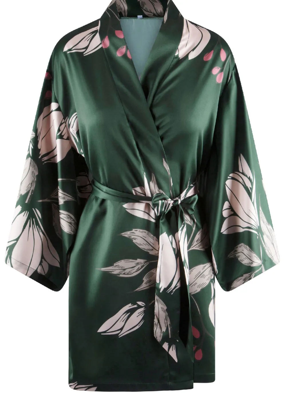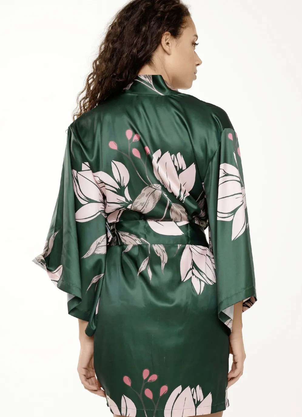 Edel schimmernder, dunkelgrüner Kimono von „LingaDore“, mit rosé-oliv-buntem Druckdessin, weiten Ärmeln sowie angenähtem Bindegürtel.
