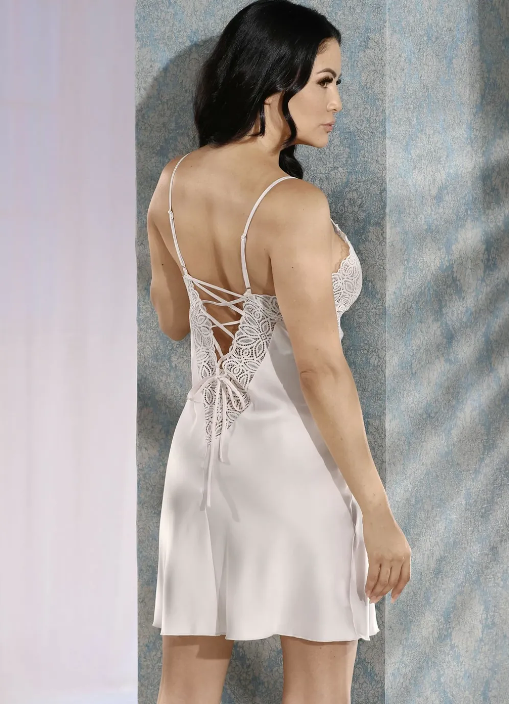 Zauberhaftes „LingaDore“-Negligé in Puder, mit hübscher Elastikspitze im Vorder- und Rückteil, raffinierter, rückwärtiger Schnürung sowie verstellbaren Spaghettiträgern.