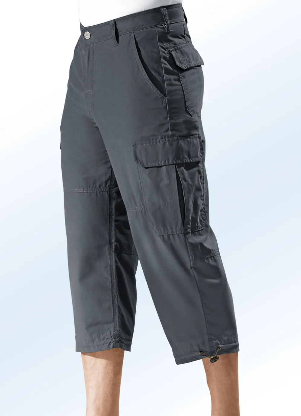 Sommerliche Long-Bermudas mit Seitentaschen, Cargotaschen mit Patte und Klettverschluss, Kordelzug mit Stopper an den Beinabschlüssen sowie Gesäßpattentaschen mit Klettverschluss.