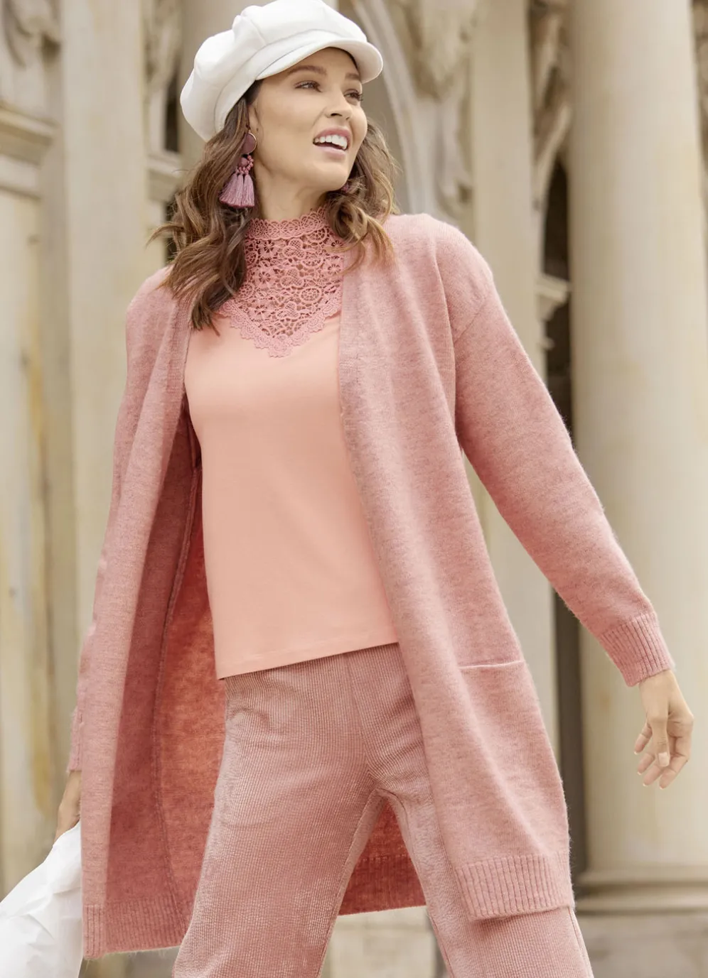 Long-Strickjacke mit eingesetzten Taschen in Rosé Meliert und in Größe 36.