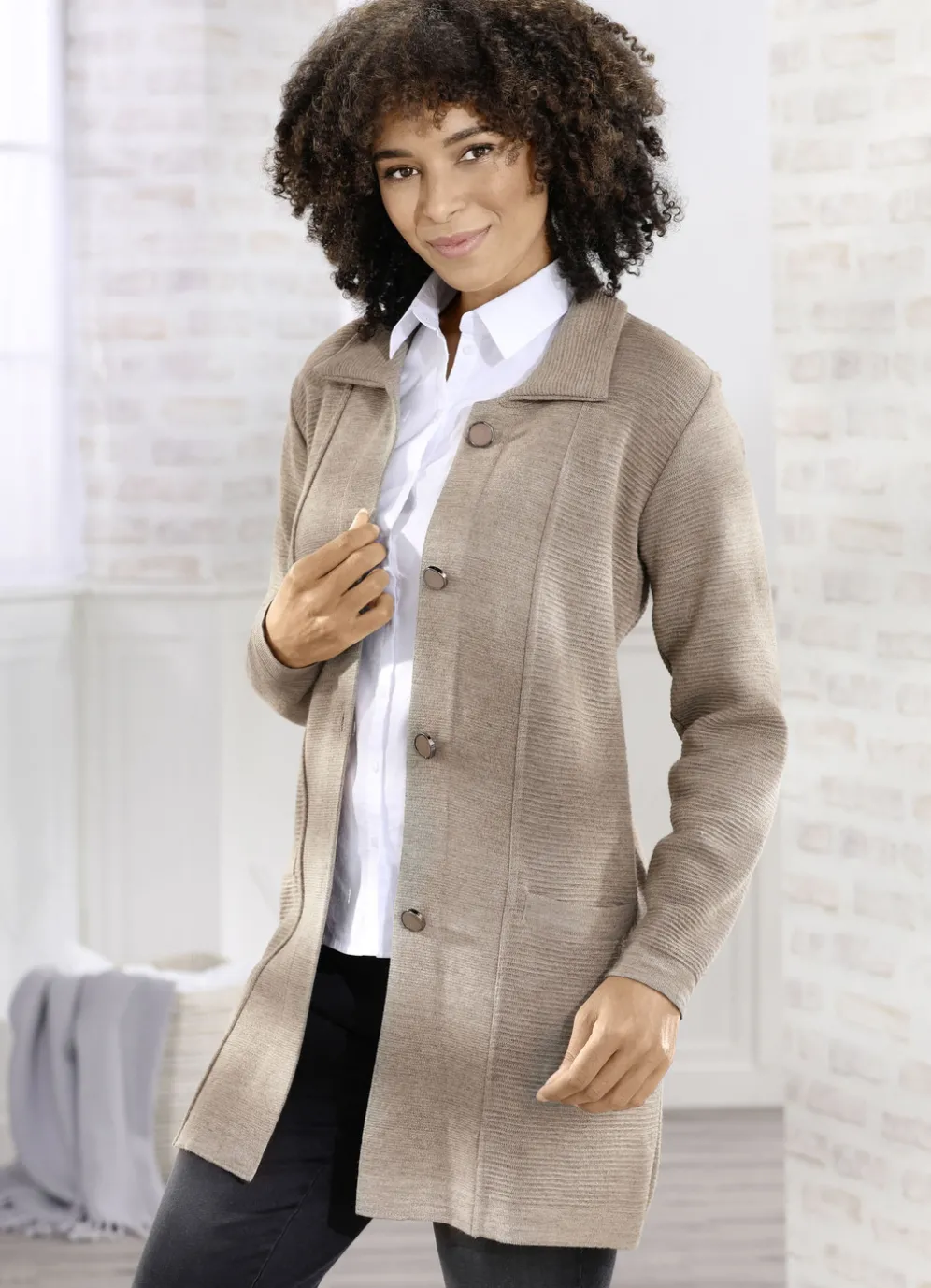 Hochwertige Long-Strickjacke in Sand: feines, dezentes Strukturmuster am Umlegekragen, den langen Ärmeln, im Rückteil und seitlich im Vorderteil, dekorative Knöpfe, zwei eingearbeitete Taschen sowie Melange-Effekte allover.