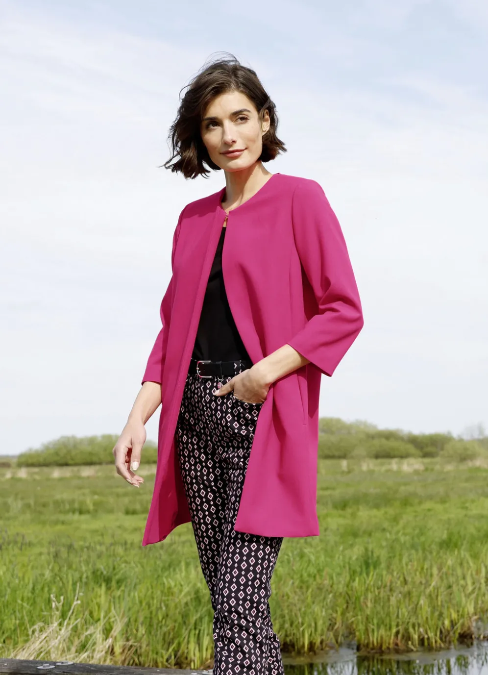 Longblazer mit Häkchenverschluss am runden Halsausschnitt, 3/4 langen Ärmeln sowie Nahttaschen. Länge ca. 80 cm.
