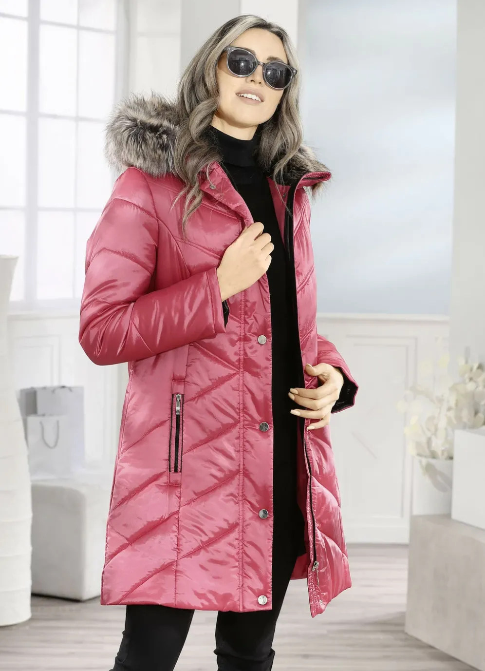 Exzellente Longjacke in Koralle: feste Kapuze mit Durchzugsband, Stopper und abnehmbarem Kunstpelz-Besatz, durch Reißveschluss unter der Druckerleiste hoch schließbarer Stehkragen, Reißverschlusstaschen, Ärmelumschlag in Kontrast möglich sowie eine Innentasche. Länge ca. 86 cm, bei K-Gr. ca. 80 cm.