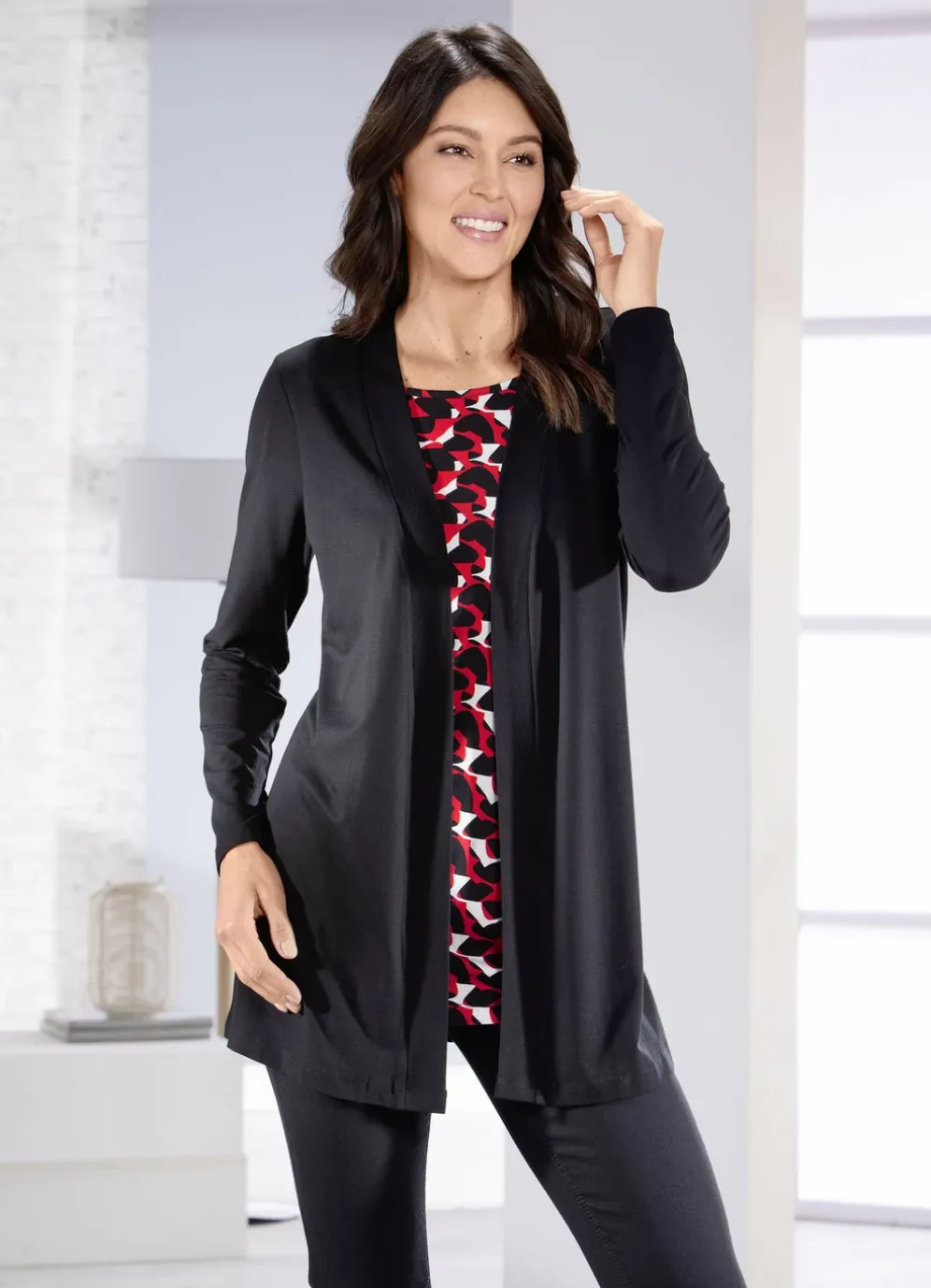 Jedes Teil ein Unikat! Geschmackvolles, schwarzes Longshirt in 2-in-1 Optik mit farbbrilliantem Druckeinsatz in Rot-Schwarz-Ecru.