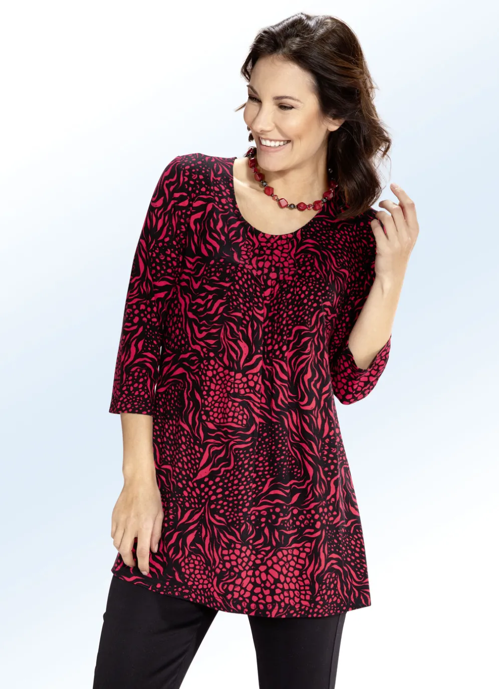 Attraktives, allover gemustertes Longshirt mit Faltenlegung im Vorderteil und 3/4-langen Ärmeln.