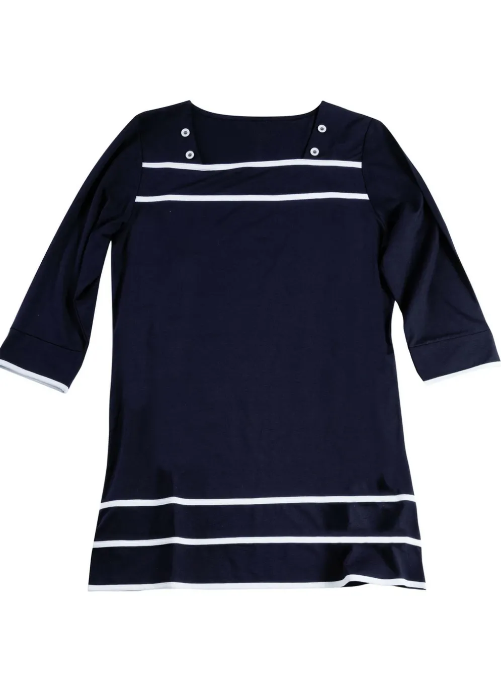 In bester Qualität und Verarbeitung zeigt sich dieses schicke schwarze Longshirt mit Karree-Ausschnitt, Zierknöpfen und weißer Paspelierung im Vorderteil und an den 3/4-langen Ärmeln.