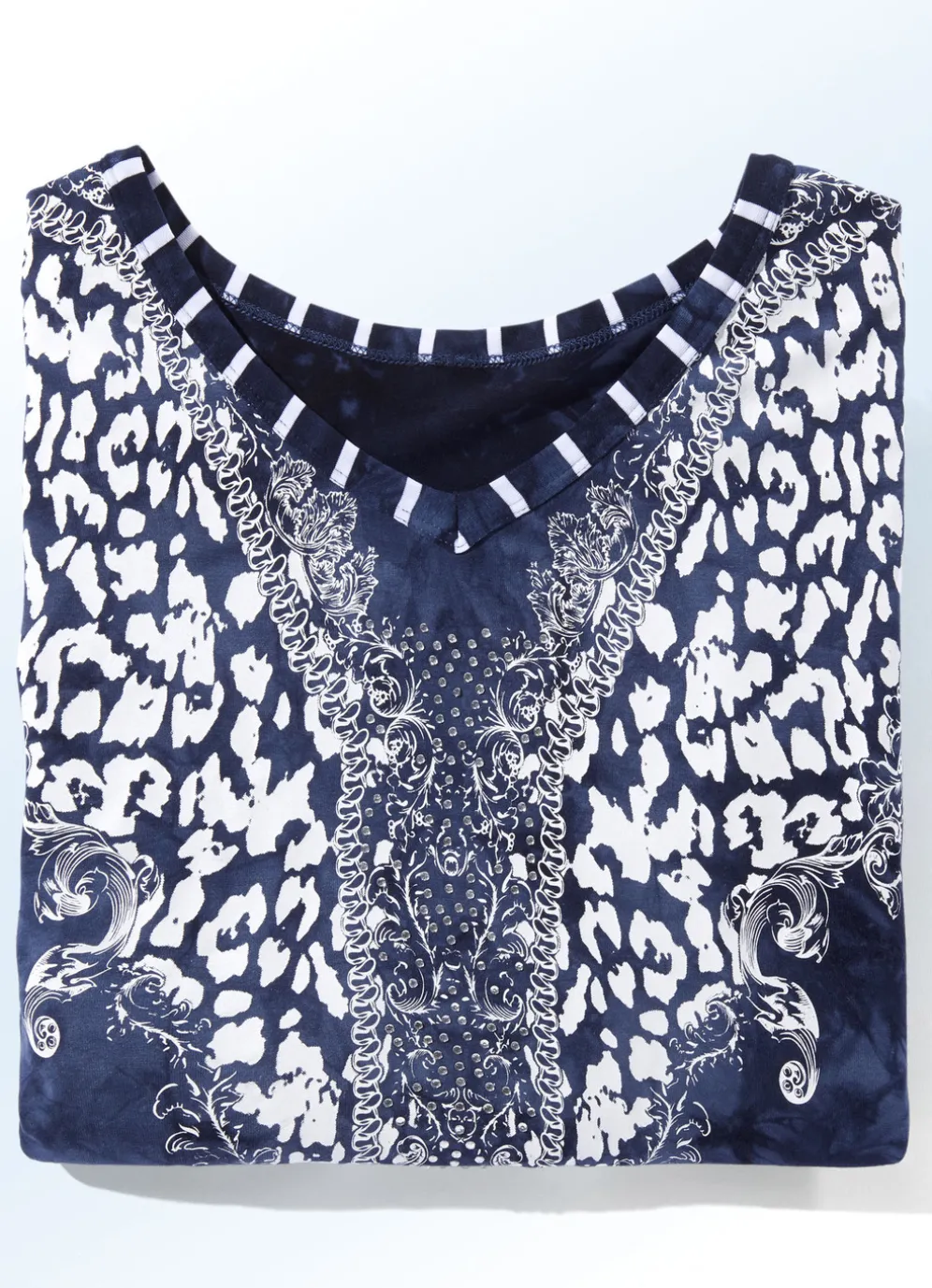 Longshirt mit V-Ausschnitt in 2 Farben in Marine Batik und in Größe 36.