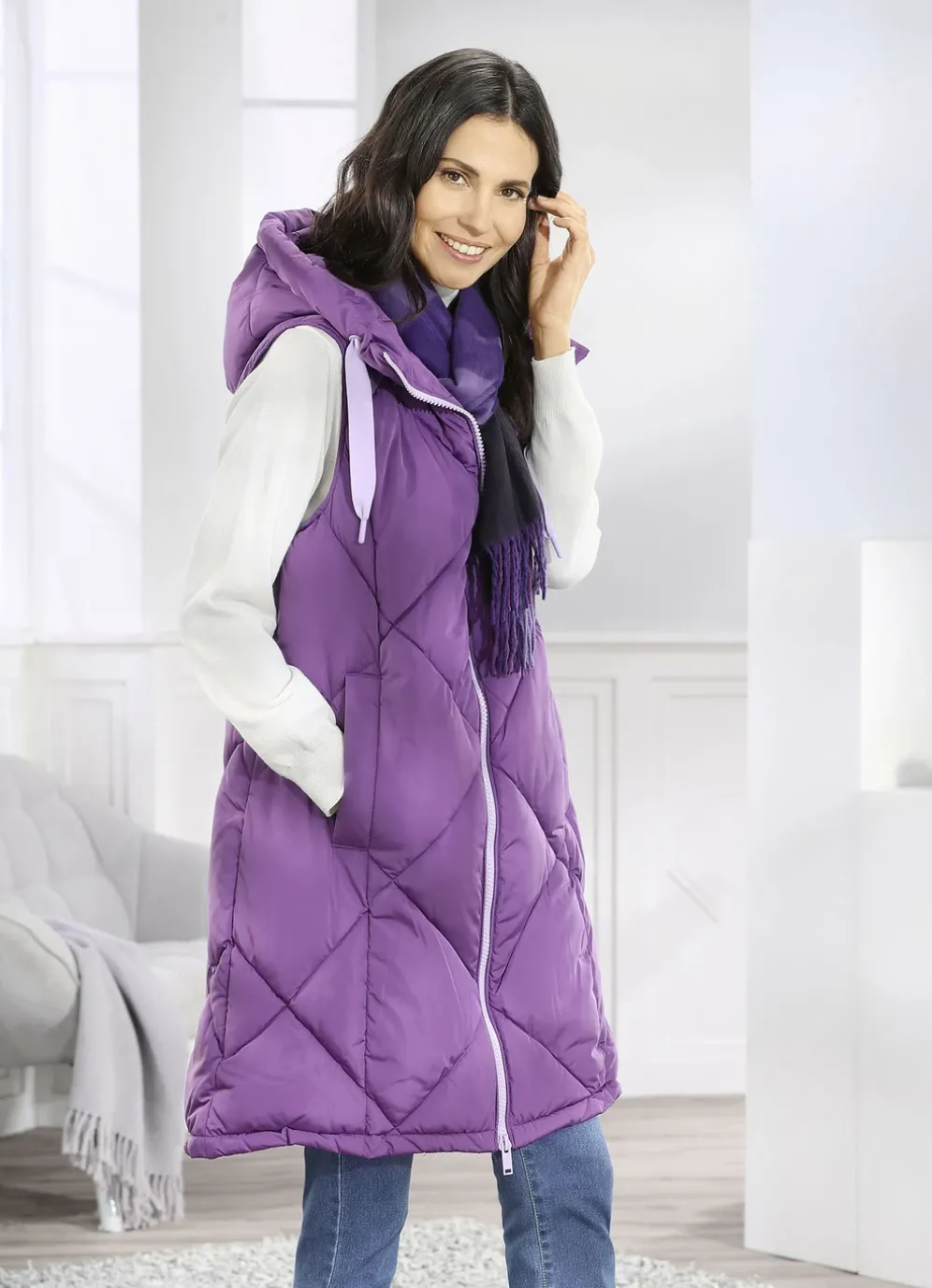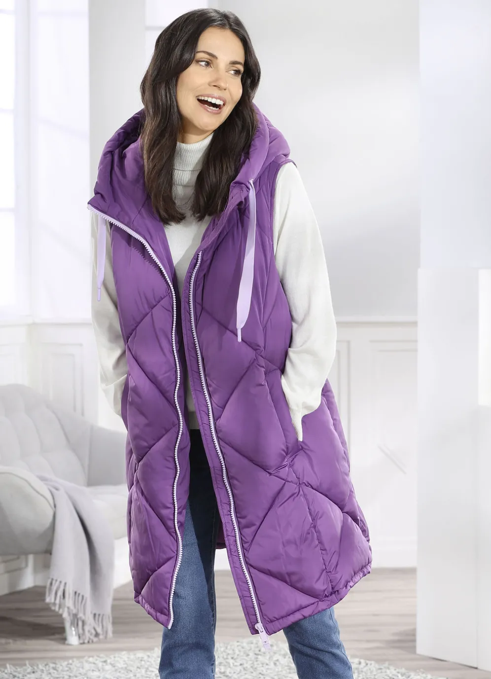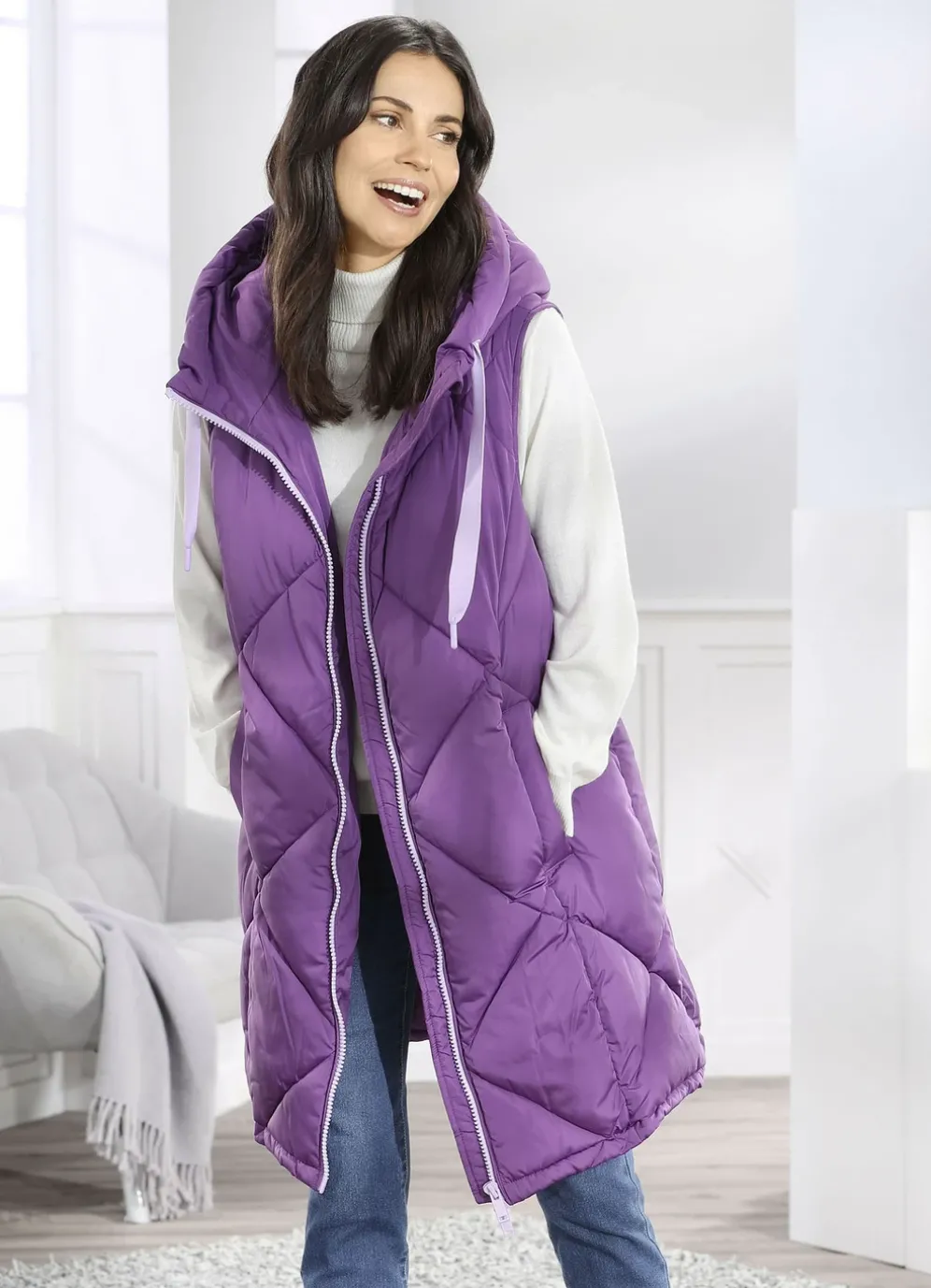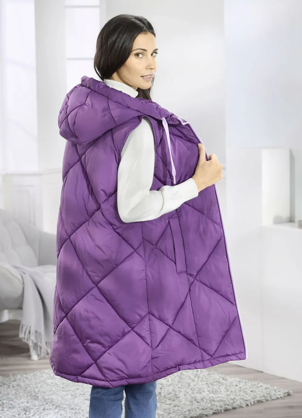 Amethystfarbene Longweste: feste Kapuze mit Bindeband, 2-Wege-Reißverschluss, Schubtaschen mit breiter Blende, eine Innentasche sowie leicht verlängertes, abgerundetes Rückteil. Länge ca. 100 cm. Die Qualität: Micro-Popeline und Watte jeweils aus 100% Polyester. Waschbar Longweste: feste Kapuze mit Bindeband, 2-Wege-Reißverschluss, Schubtaschen mit breiter Blende, eine Innentasche sowie leicht verlängertes, abgerundetes Rückteil. Länge ca. 100 cm.