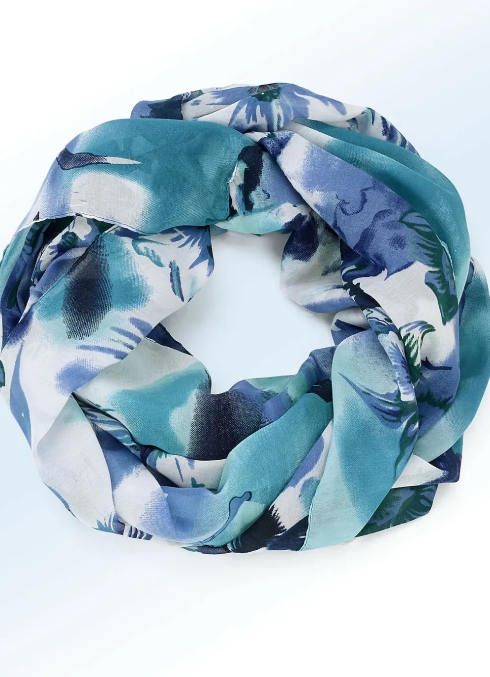Toller Loop-Schal, dessiniert mit Fantasieblüten in Blau- und Grüntönen auf weißem Fond. Maße: 160×65 cm