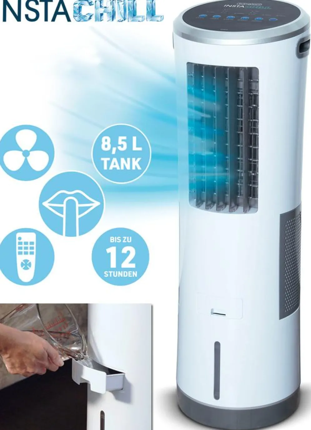 Luftkühler Livington InstaChill mit kraftvoller Leistung kühlt und erfrischt die Luft in Ihrer Umgebung mit reinem Wasser – ohne Chemie. Mit extra großem 8,5l-Tank (ausreichend für ca. 12 Stunden). Die abgekühlte und zugleich angefeuchtete Luft wird schnell und schonend verteilt. Mit Schwenk-Funktion der Lamellen – für eine gleichmäßige Verteilung. Mit 3 Geschwindigkeits- und Kühlstufen und einem praktischen Timer und Fernbedienung sowie einem integrierten Nachtlicht. Mobil und überall einsetzbar.