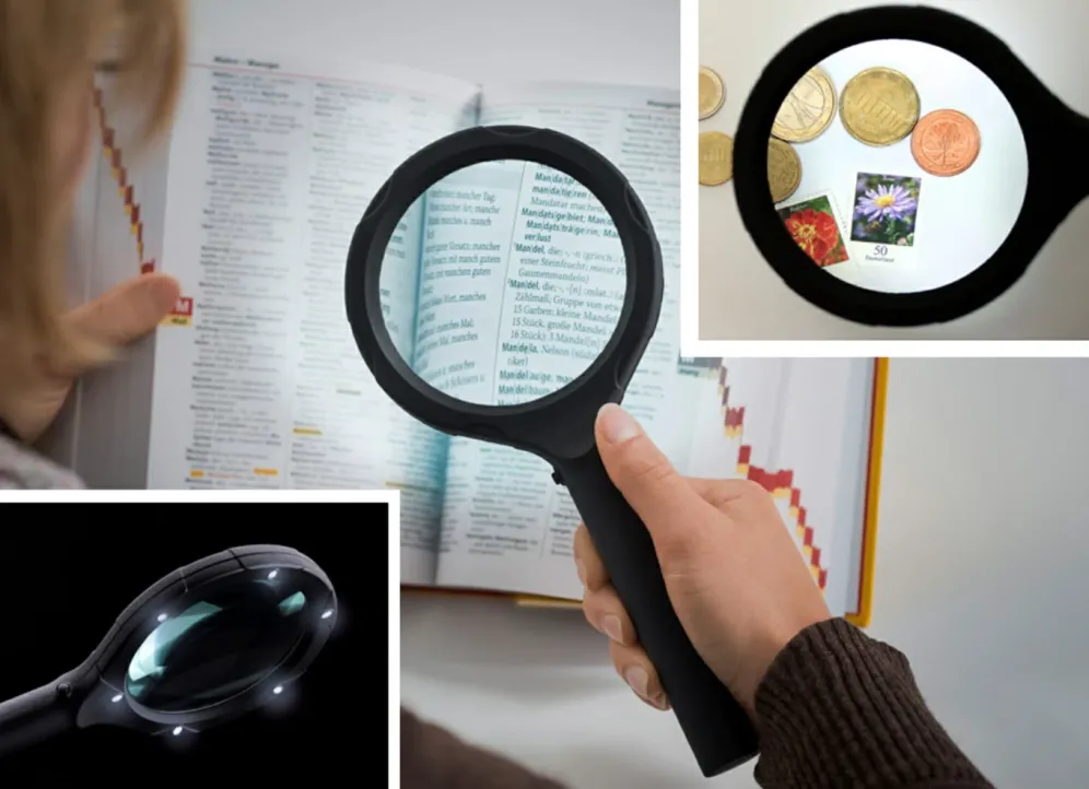 Diese Lupe sorgt stets für den optimalen Durchblick, ob bei kleiner Schrift, kniffligen Reparaturen oder einfach nur zum Studieren kleinerer Objekte wie Briefmarken oder Münzen. Die Linse hat einen komfortablen Durchmesser von 8,5 cm. So entsteht ein großes Sichtfeld, die Lupe braucht nicht ständig hin und her bewegt zu werden, das Lesen und Betrachten ist weniger anstrengend. Auf Knopfdruck beleuchten 6 superhelle, energiesparende LEDs (17 Lumen) das Sichtfeld. Die Lupe mit 2,5-facher Vergrößerung hilft in vielen Alltagssituationen. Batteriebetrieben (Batterien nicht im Lieferumfang enthalten).