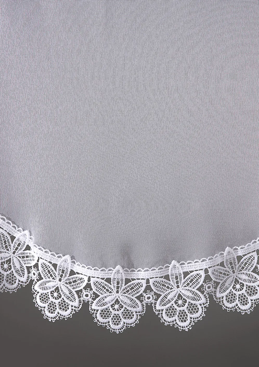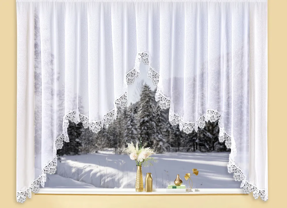 Qualität aus deutscher Herstellung! Himmlischer, weißer M-Bogen-Store aus echter Plauener Spitze. Mit Universalschienenband. Die Qualität: Drehersablé aus 100% Polyester