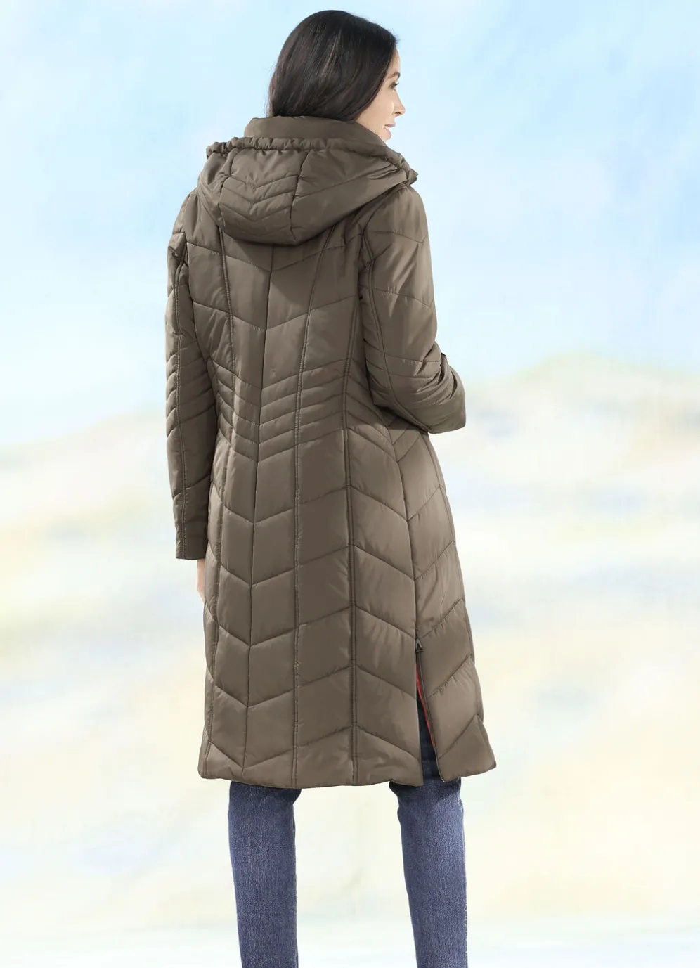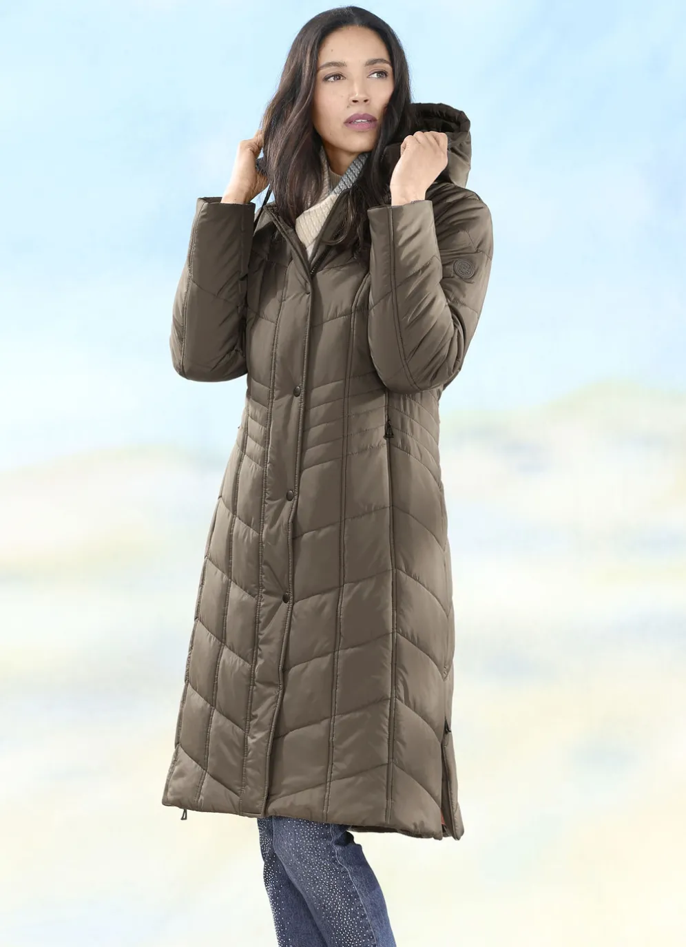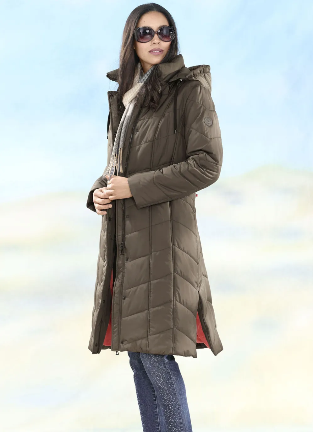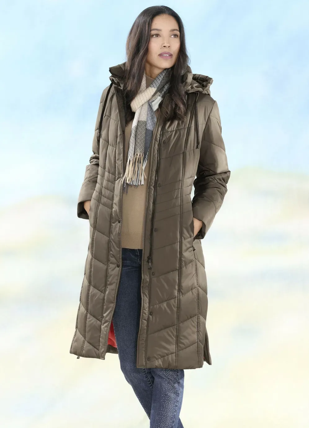 Ansprechender Mantel mit Durchzugsband und Stopper in der abnehmbaren Kapuze, durch Reißverschluss unter der Druckerleiste hoch schließbarem Stehkragen, Reißverschluss an den Nahttaschen und Seitenschlitzen, umschlagbaren Ärmeln sowie einer Innentasche. Länge ca. 105 cm.
