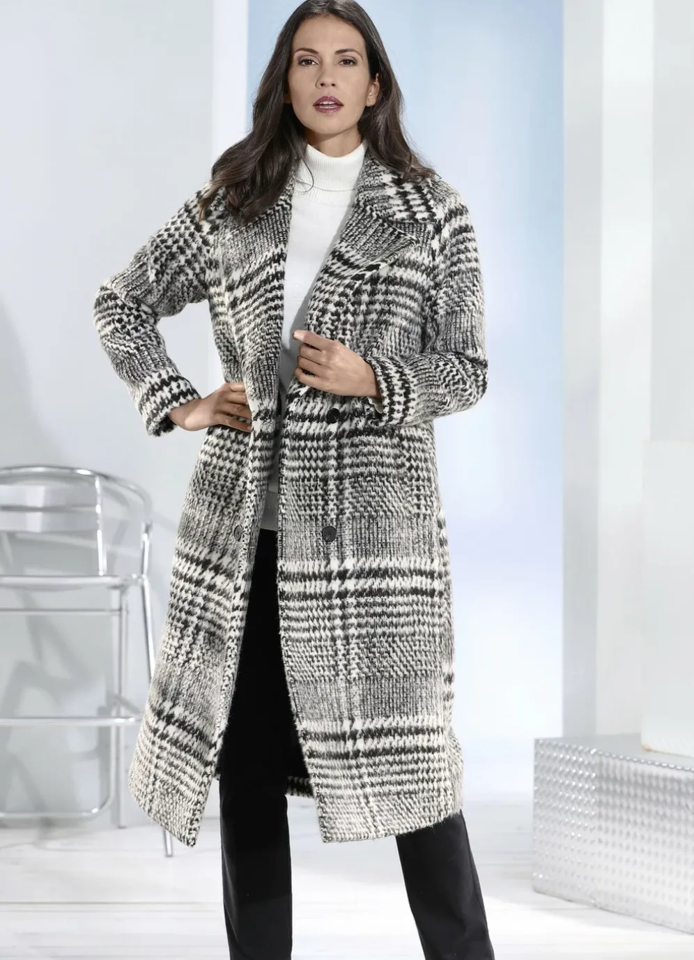 Lassen Sie sich dieses Modell nicht entgehen! Exquisiter Mantel in 2-reihiger-Optik: trendstarkes Glencheck-Dessin in Schwarz-Weiß, großer Reverskragen, Schubtaschen mit schmaler Blende sowie verdeckter Gehschlitz. Länge ca. 108 cm.