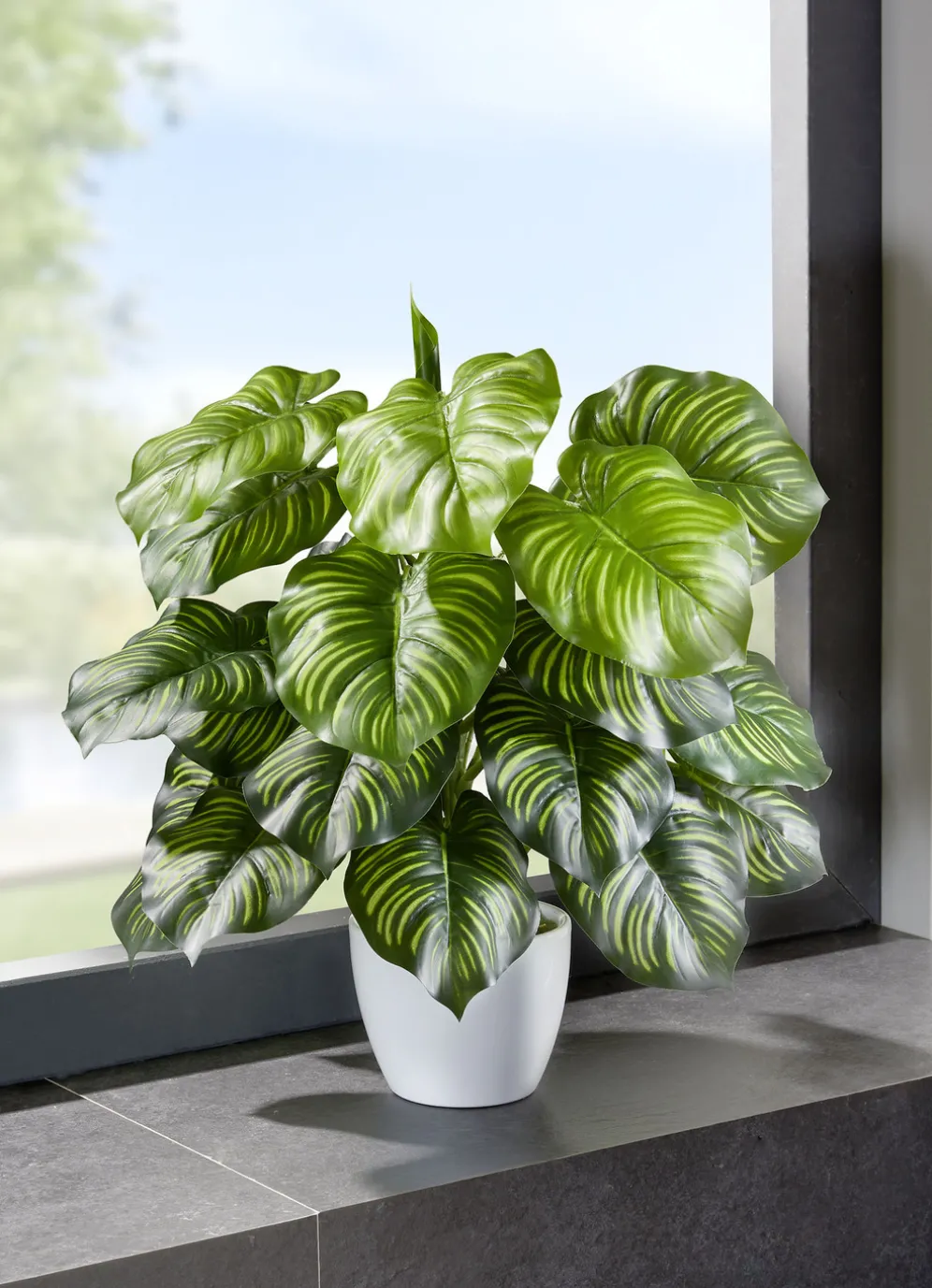 Dieser schöne Marantabusch ist das ganze Jahr über schön grün, auch in dunklen Ecken des Zimmers. Aus hochwertigem Kunst- und Textilmaterial hergestellt. Fest in einen weißen Keramiktopf eingesetzt und mit Naturmoos abgedeckt. Maße: ca. Höhe 50 cm, Topf Ø 11,5 cm, Höhe 9,5 cm