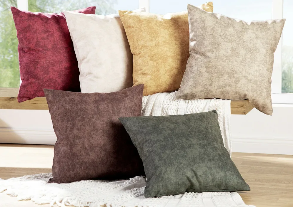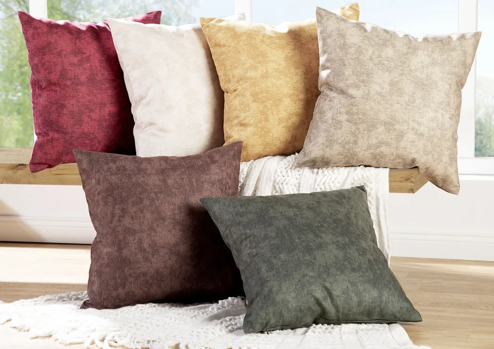 Hübsche, marmorierte Kissenbezüge. Mit praktischem Reißverschluss gearbeitet. Die Qualität: Velours aus 100% Polyester.