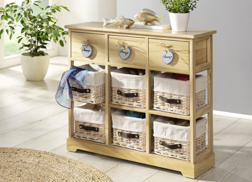 Massivholz Kommode mit Körbe aus Weide in Natur.