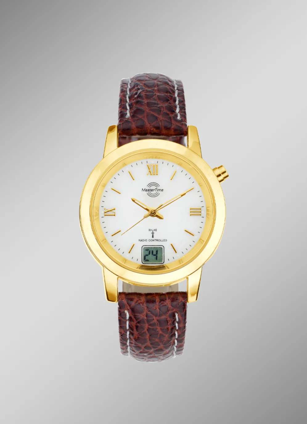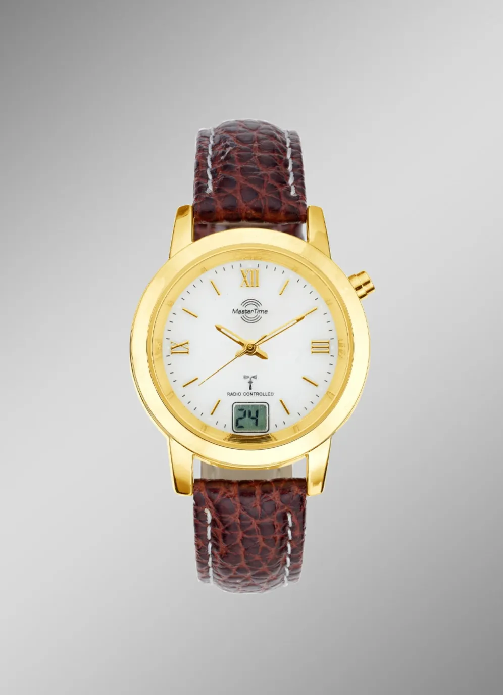 Master Time-Funk-Damenuhr mit Gehäuse aus Metall und mit einem Uhrenband aus Leder.