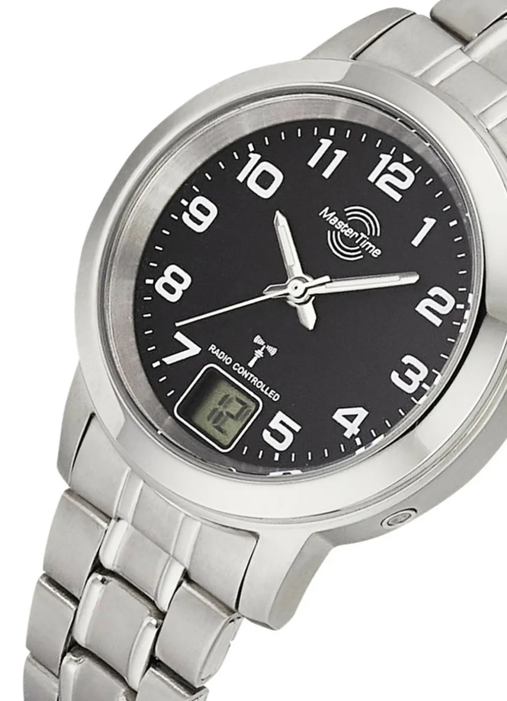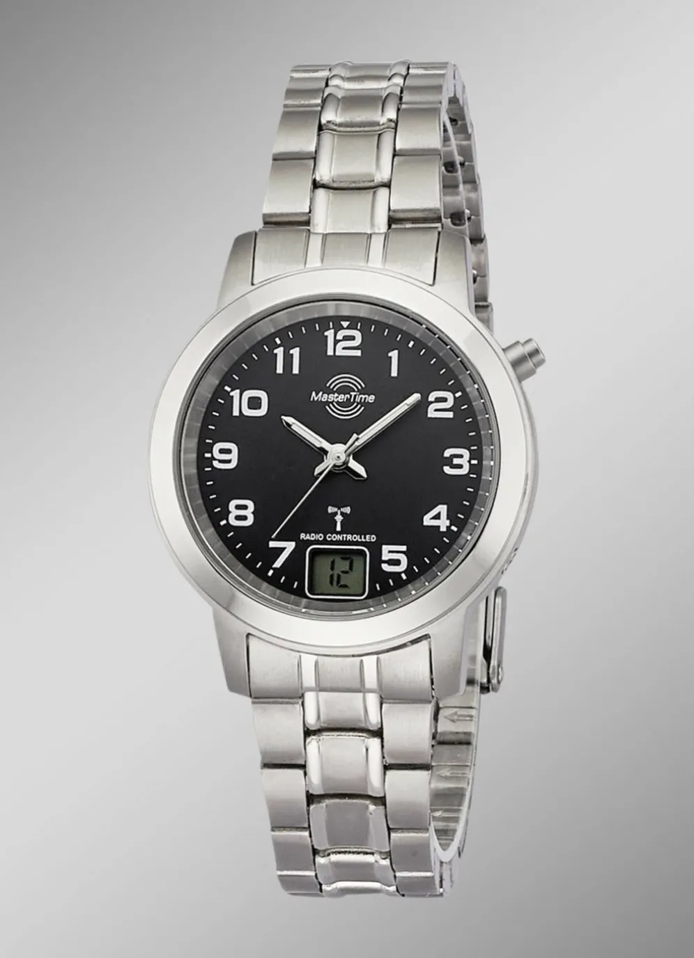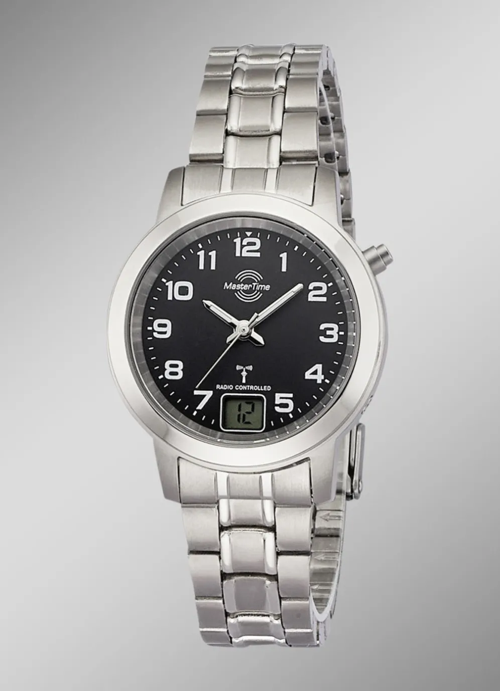 Sportliche Funk-Damenuhr aus Titan mit digitaler Tages- und Datumsanzeige. Die Damen Armbanduhr ermöglicht eine automatische Umstellung zwischen Sommer- und Winterzeit. Das schwarze Zifferblatt dieser Funkuhr ist gut ablesbar und mit Leuchtzeigern versehen. Das Material Titan ist leicht, extem widerstandsfähig und antiallergisch. Die Damenuhr ist 5 bar wasserdicht und hat einen Gehäusedurchmesser von 34 mm.