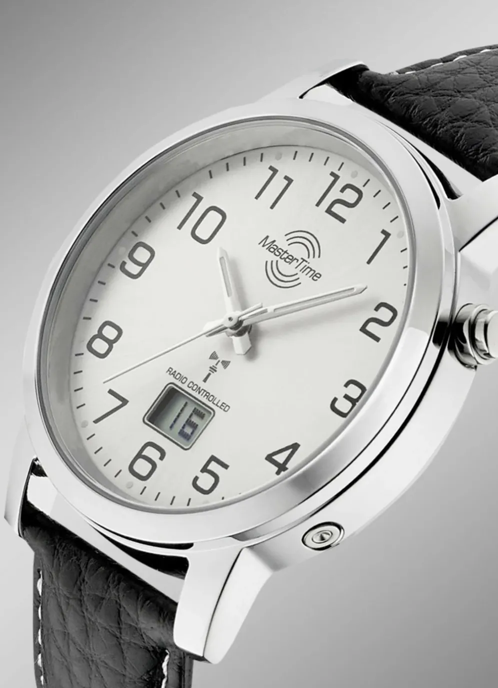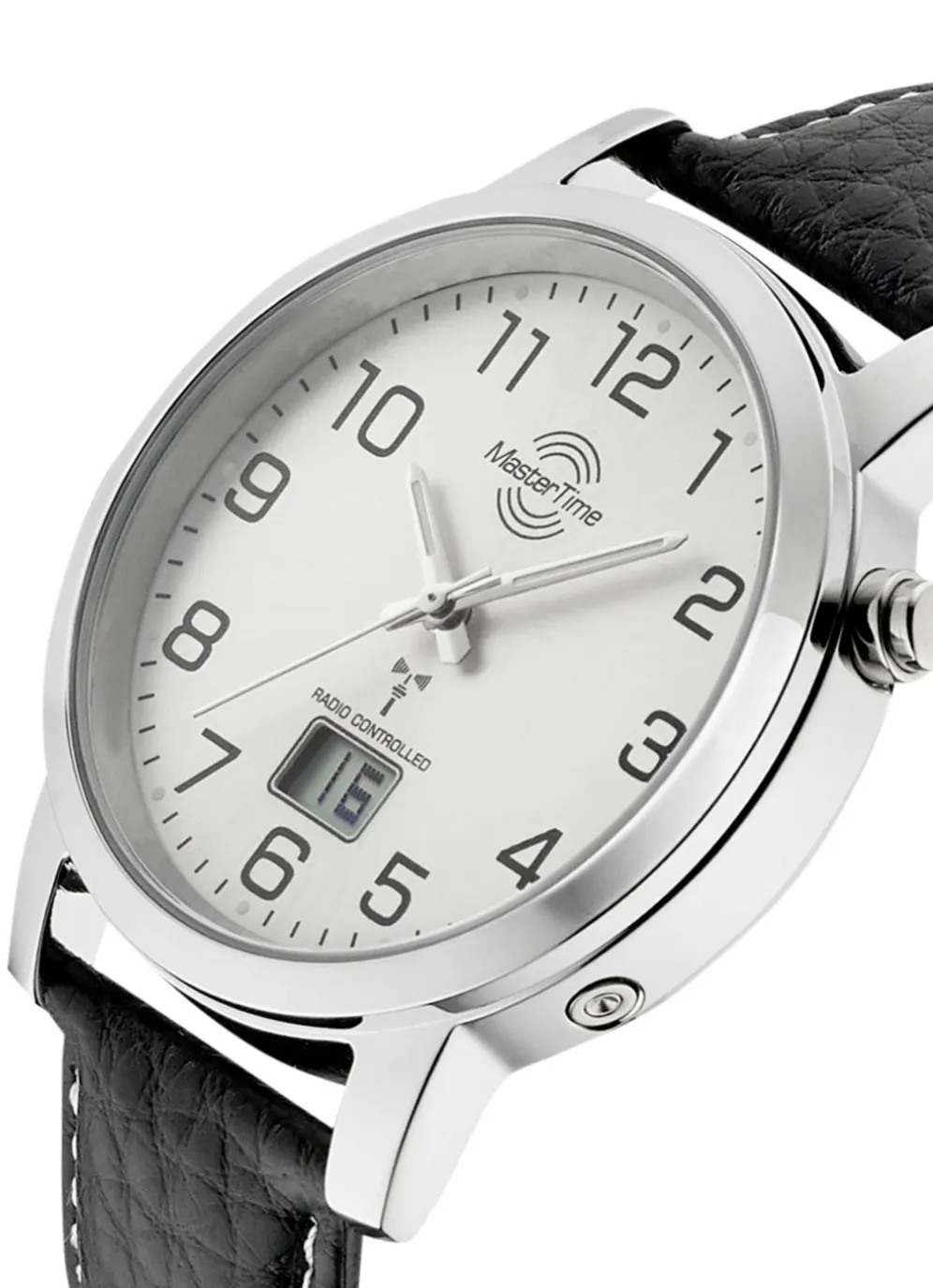 Diese klassische Herrenuhr mit silberfarbenem Zifferblatt besitzt ein schwarzes Lederarmband mit Dornschließe und eine digitale Anzeige mit Kalendefunktion. Das zuverlässige Funkuhrwerk bietet eine stets genaue Zeitanzeige. Die Herrenuhr hat einen Gehäusedurchmesser von 42 mm und ist 3 bar wasserdicht.